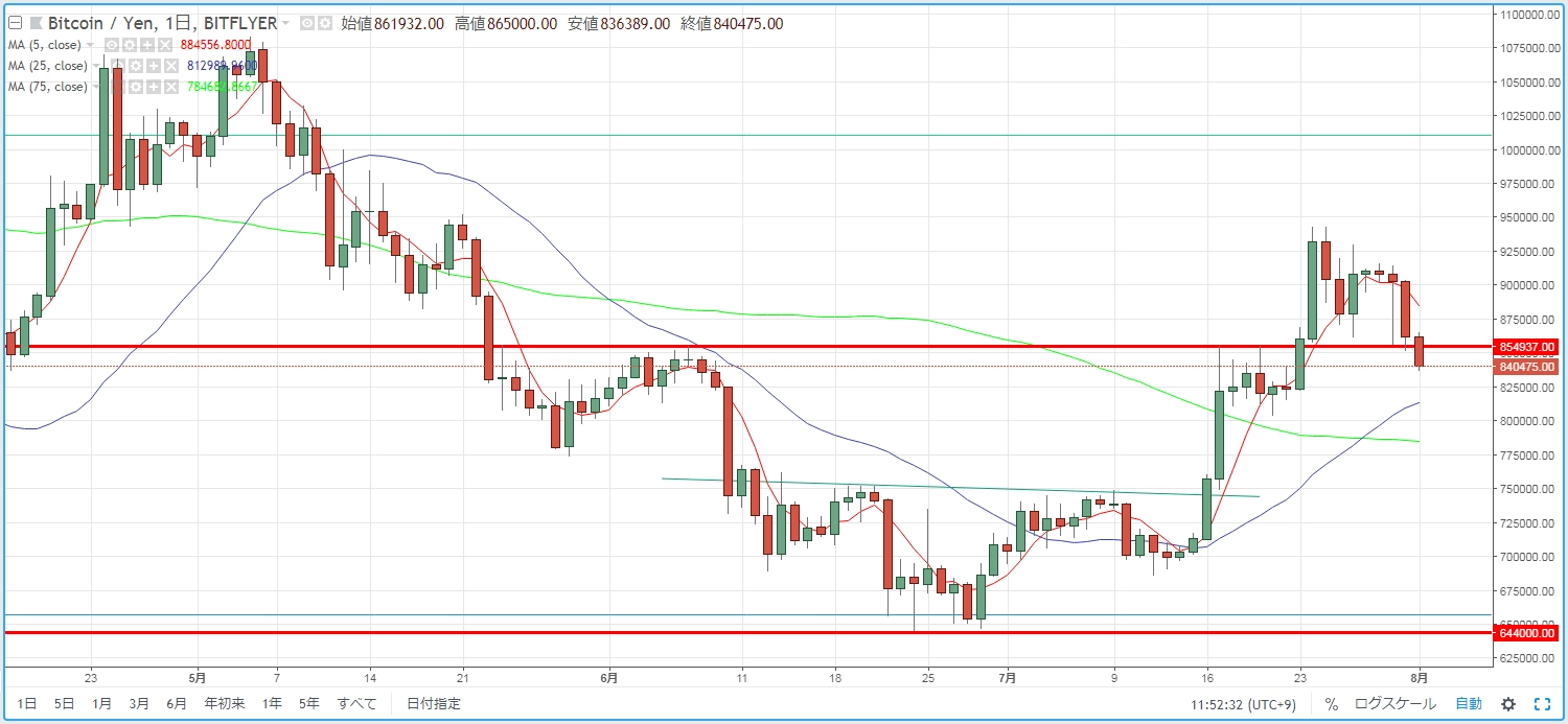 BTCJPYでデイトレする目安として、ピボットを確認します。昨日(7月31日)は、売り方の勢いが強く、始値からほぼ上昇することなく下げ続けた相場環境でした。