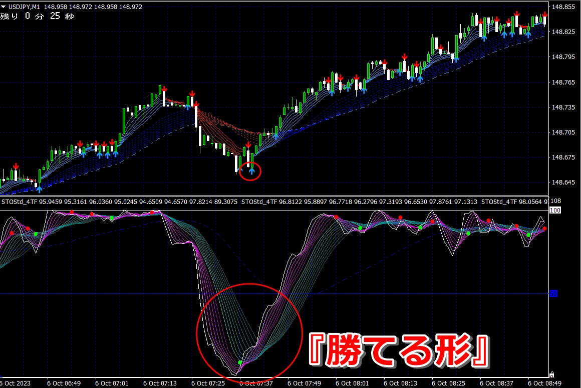 ② 矢印サイン点灯状態で、インジケーターのピンク色の帯が、緑の帯を下からすくい上げるような形状であれば、現在のローソク足が確定する数秒前か確定の直後に1分判定または3分判定でハイエントリーします。