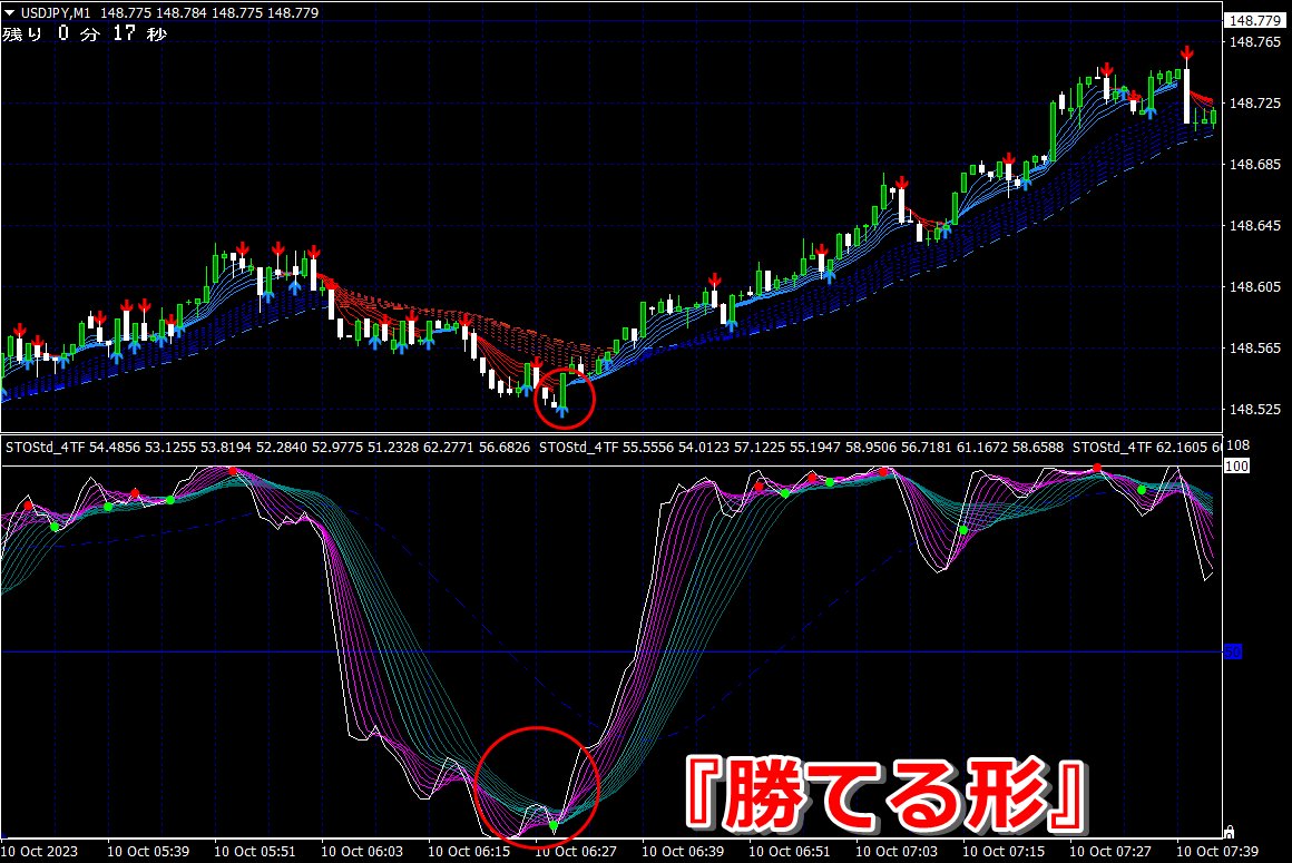 ② 矢印サイン点灯状態で、インジケーターのピンク色の帯が、緑の帯を下からすくい上げるような形状であれば、現在のローソク足が確定する数秒前か確定の直後に1分判定または3分判定でハイエントリーします。