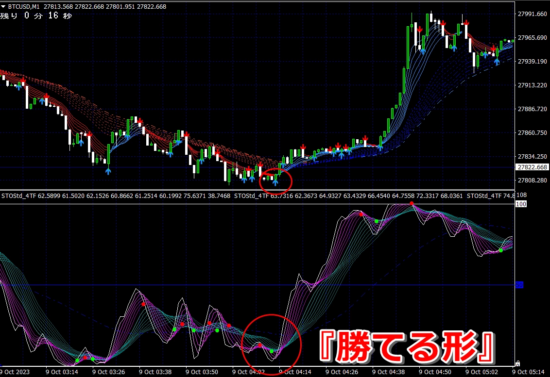 ② 矢印サイン点灯状態で、インジケーターのピンク色の帯が、緑の帯を下からすくい上げるような形状であれば、現在のローソク足が確定する数秒前か確定の直後に1分判定または3分判定でハイエントリーします。
