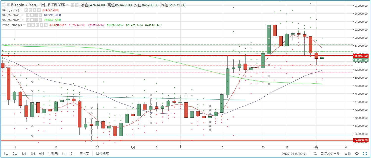 画像は2018年8月2日のキャプチャ。ここ数日、全面的に下げる展開が続いている相場環境でした。そんな中、リップルは+3%と上昇に転じたところを示しています。