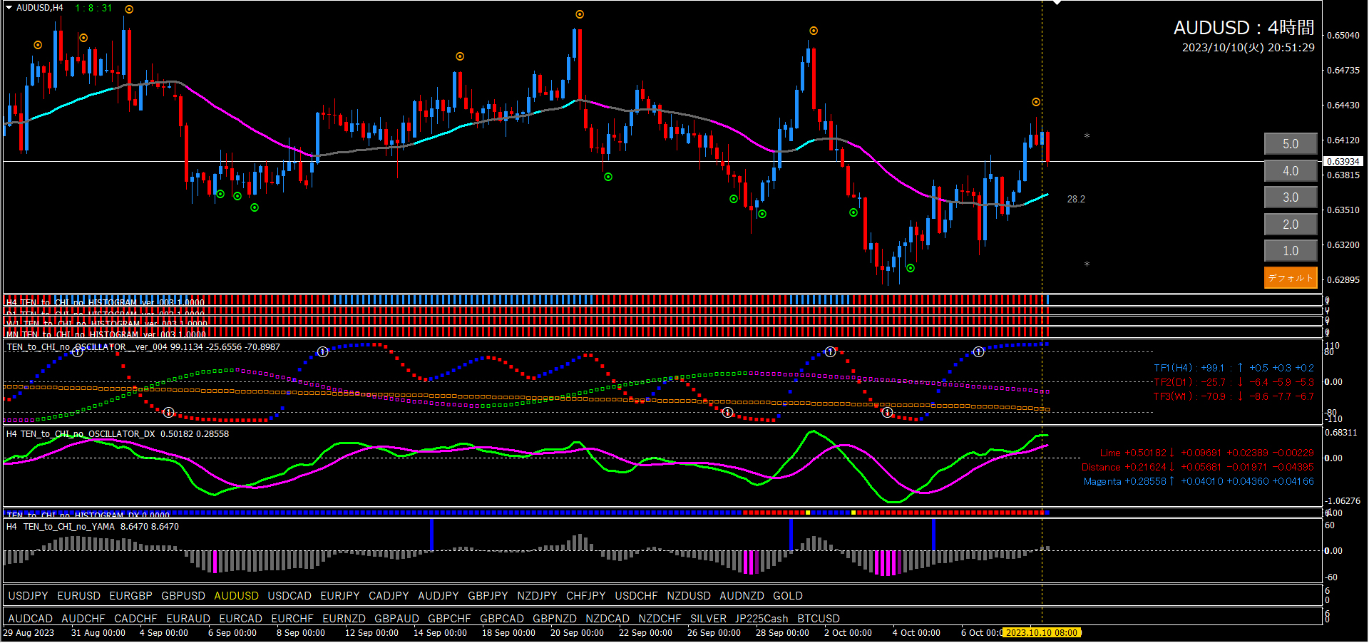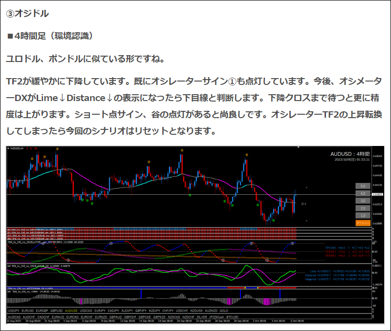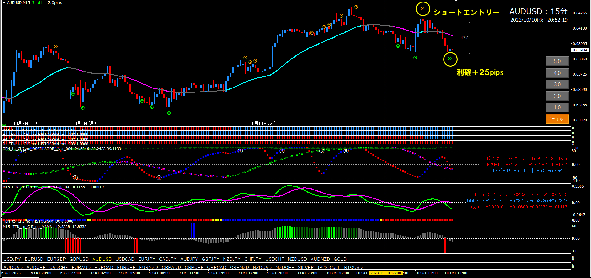 オシレーターTF2の位置がまだゼロラインより上で良い位置にあると言えます。オシレーターDXはまだ収束していませんでしたが、4時間足で下目線と明確に判断しているので、点サイン+TF2のみを根拠にしたエントリーでも優位性は高いです。