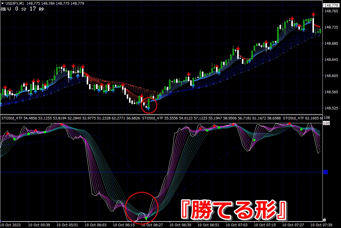 ② 矢印サイン点灯状態で、インジケーターのピンク色の帯が、緑の帯を下からすくい上げるような形状であれば、現在のローソク足が確定する数秒前か確定の直後に1分判定または3分判定でハイエントリーします。