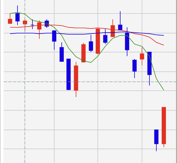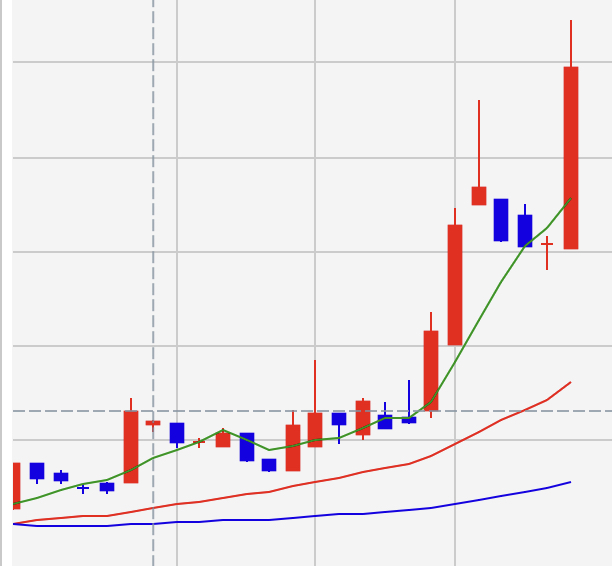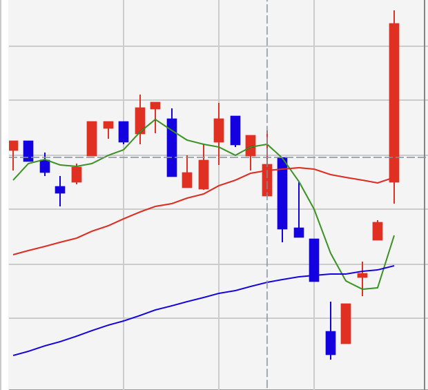 右端の急騰した後に出た長い陽線を詳しく見ていきましょう。