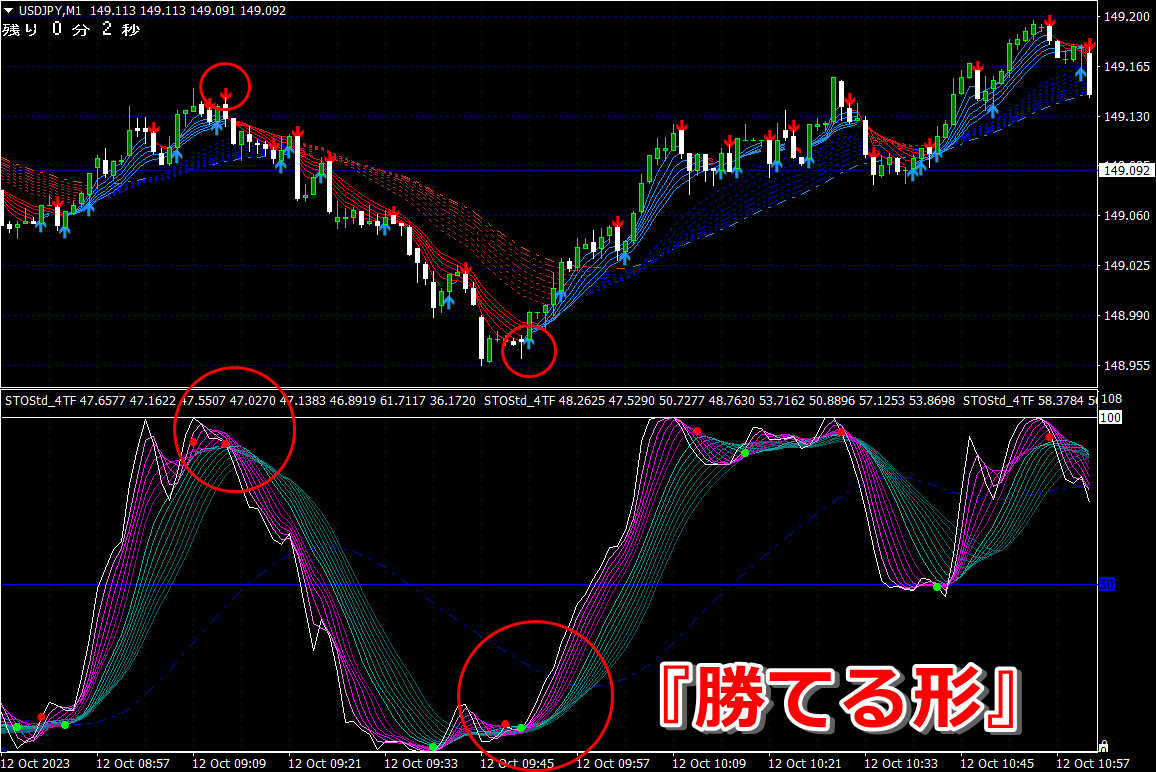 ② 矢印サイン点灯状態で、インジケーターのピンク色の帯が、緑の帯を下からすくい上げるような形状であれば、現在のローソク足が確定する数秒前か確定の直後に1分判定または3分判定でハイエントリーします。