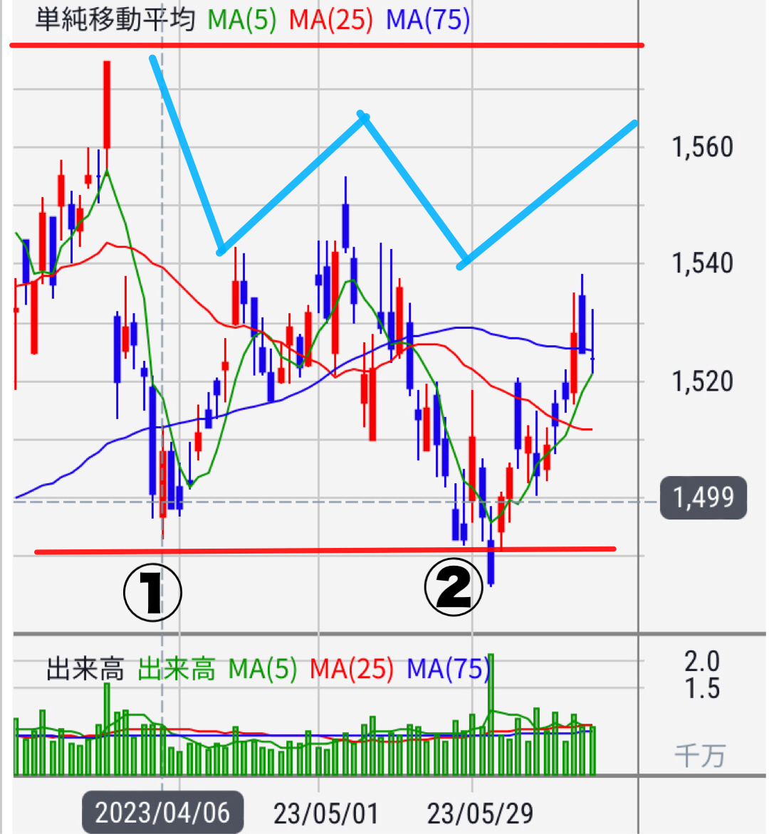 ボトムラインにダブルボトムを書くことができなかったため、上に描きましたが、チャートには綺麗なWの形が出ています。
