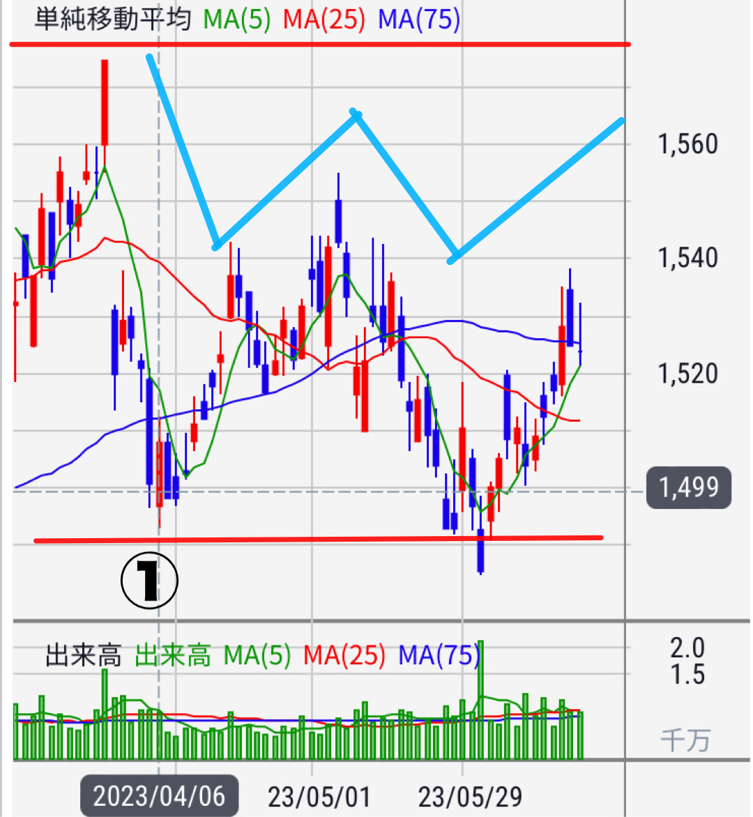 ①で下げ止まりまた上昇しています。ここでエントリーする人は多いかと思いますが、より根拠となる手法をここでは書いていきます。