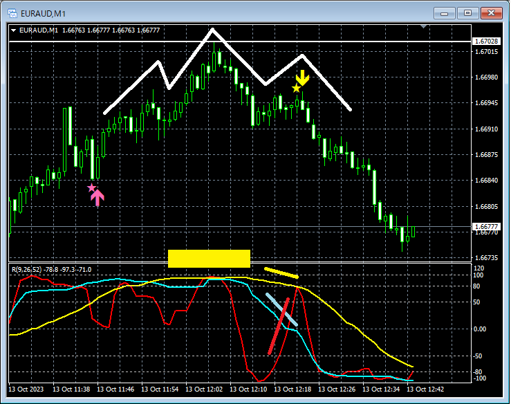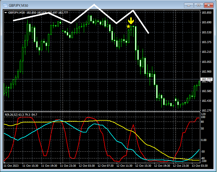 三尊の右肩でmBDSR(RCI2本フィルター)の戻り売りサインが点灯して下げるパターン。重要視しているパターンのひとつである。