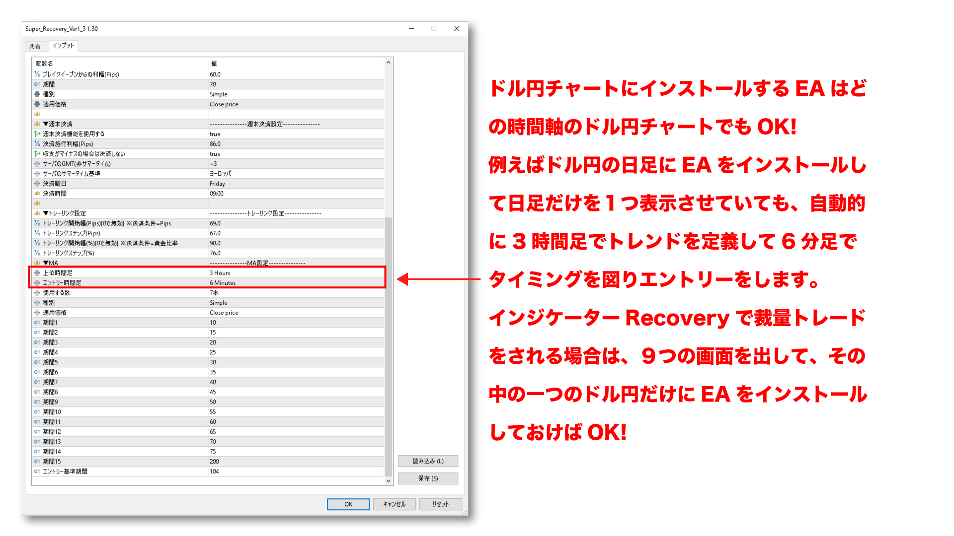 一つ目はSuper Recoveryという名前のEAのご利用者様が増えてきたので、色々質問を頂いており大まかな内容を皆様と共有したいと考えて動画を収録しました。
