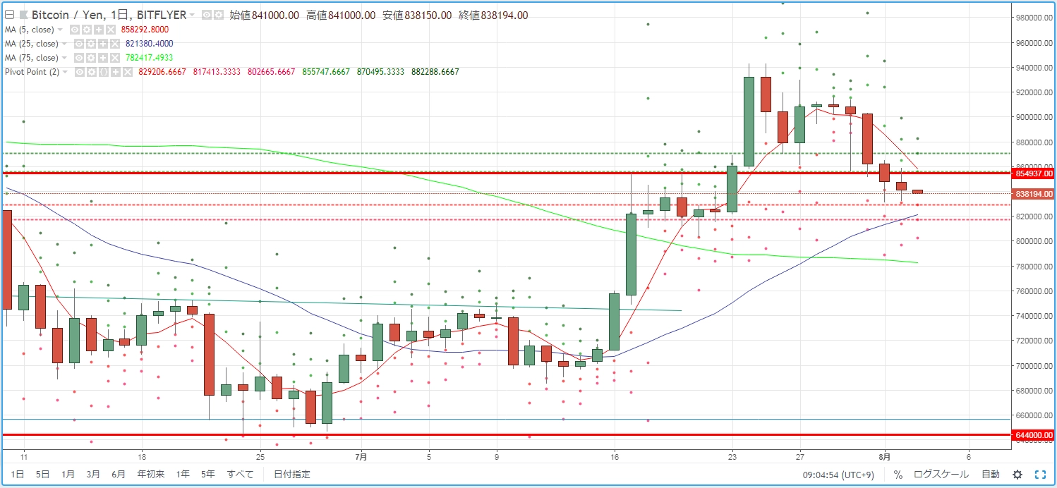 8月2日投稿の「【BTCJPY】下値支持線が上値抵抗線に転換?」では、重要ラインである約85万円水準を下抜けてしまったが上に戻ろうとする意欲が見て取れる動きがある中で、昨日の終値が同水準の上下どちらになるかに注目したいと述べました。結果として、陰線を形成し、下で終値をつけました。これにより、5陰連をつけた格好です。