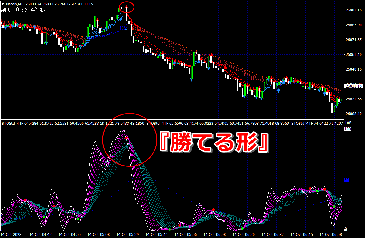 ② 矢印サイン点灯状態で、インジケーターのピンク色の帯が、緑の帯を下からすくい上げるような形状であれば、現在のローソク足が確定する数秒前か確定の直後に1分判定または3分判定でハイエントリーします。