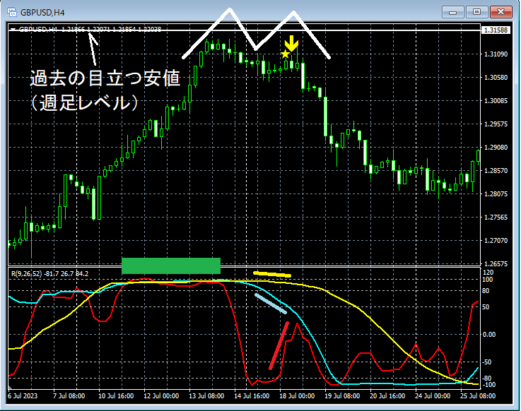 上の4時間足では、mBDSR(RCI2本フィルター)の戻り売りサインが点灯し、その直後からプライスが順調に下げていることが分かる。ダブルトップを形成して下げている点にも注目である。
