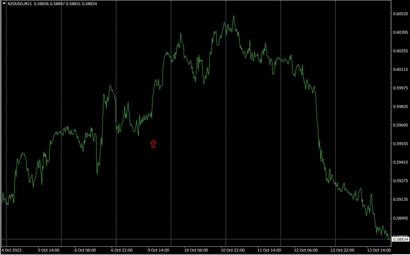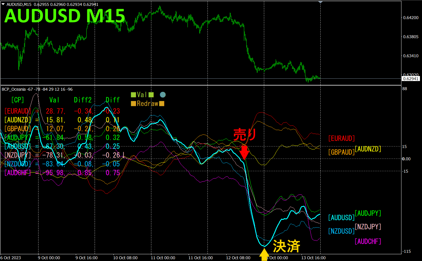 木曜日にAUDUSDが閾値を超えて下落してきたので、売りエントリーします。グラフが底に達したので、当日決済します。約60pipsの利益が得られました。