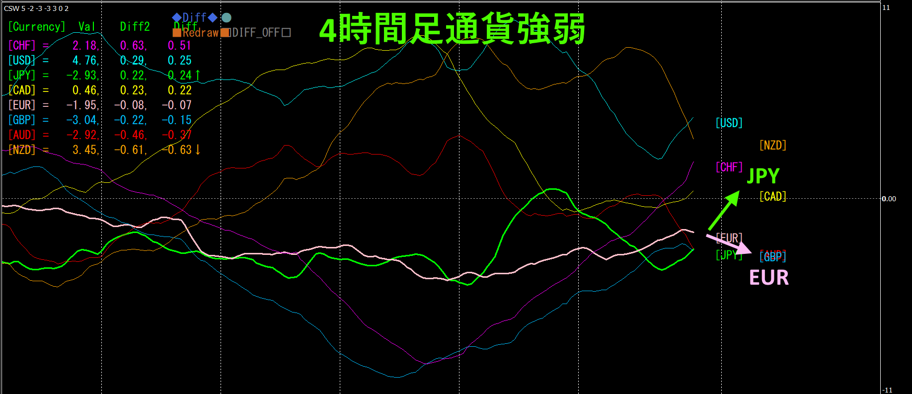 EURは水平から上方向に、JPYは一旦上昇したのですが、反転下落して下向きになっています。やはりEURがJPYよりも強い傾向にあります。今後EURJPYは上昇する見込みです。