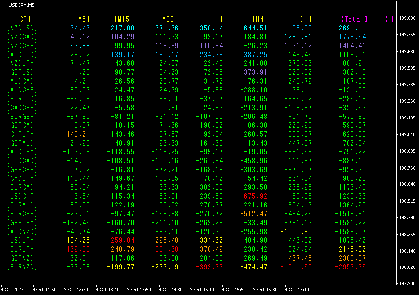 Total数値の降順に並び替えています。最も上の行にあるNZDUSDは、全時間足で青色系の表示色になっていて、Total数値が2691.11と大きなプラスの数字になっています。NZDUSDに大きな上昇トレンドが発生していることを示しています。