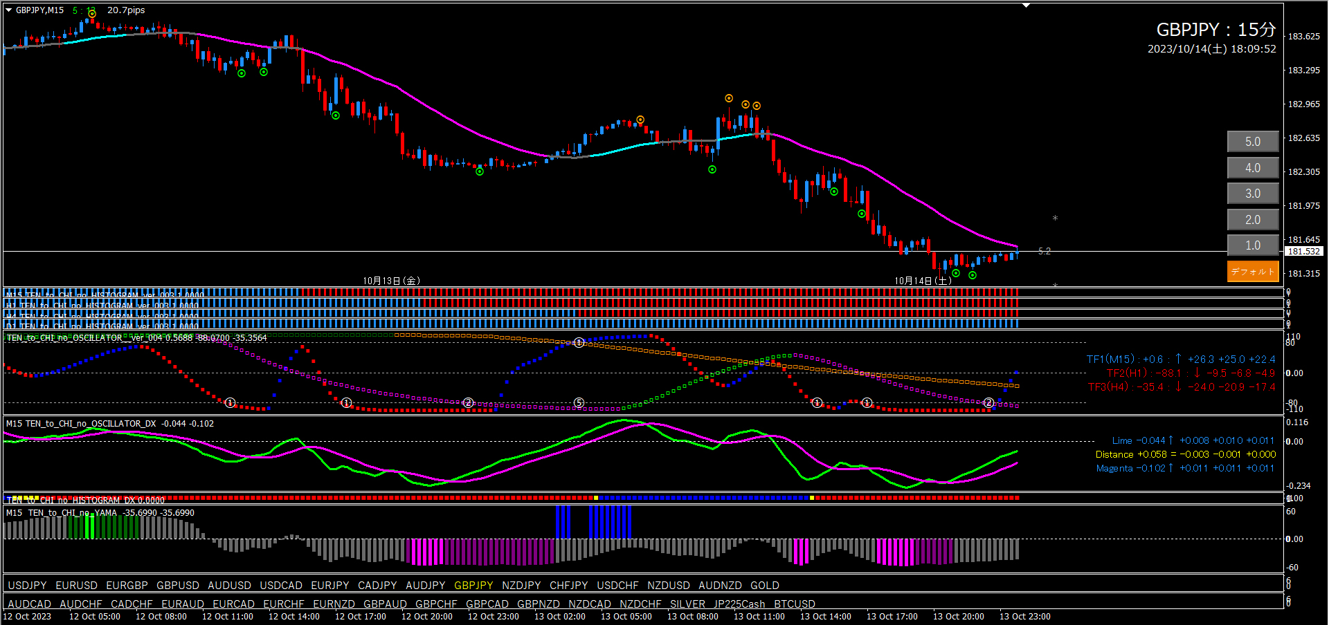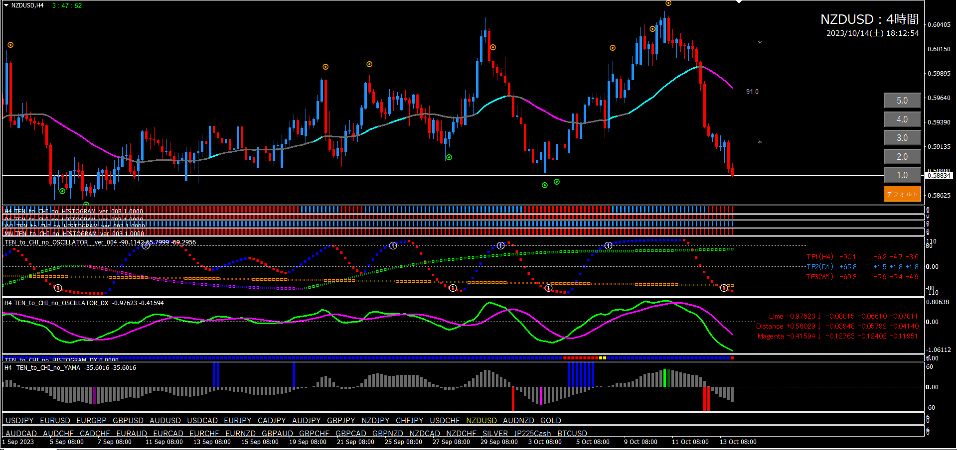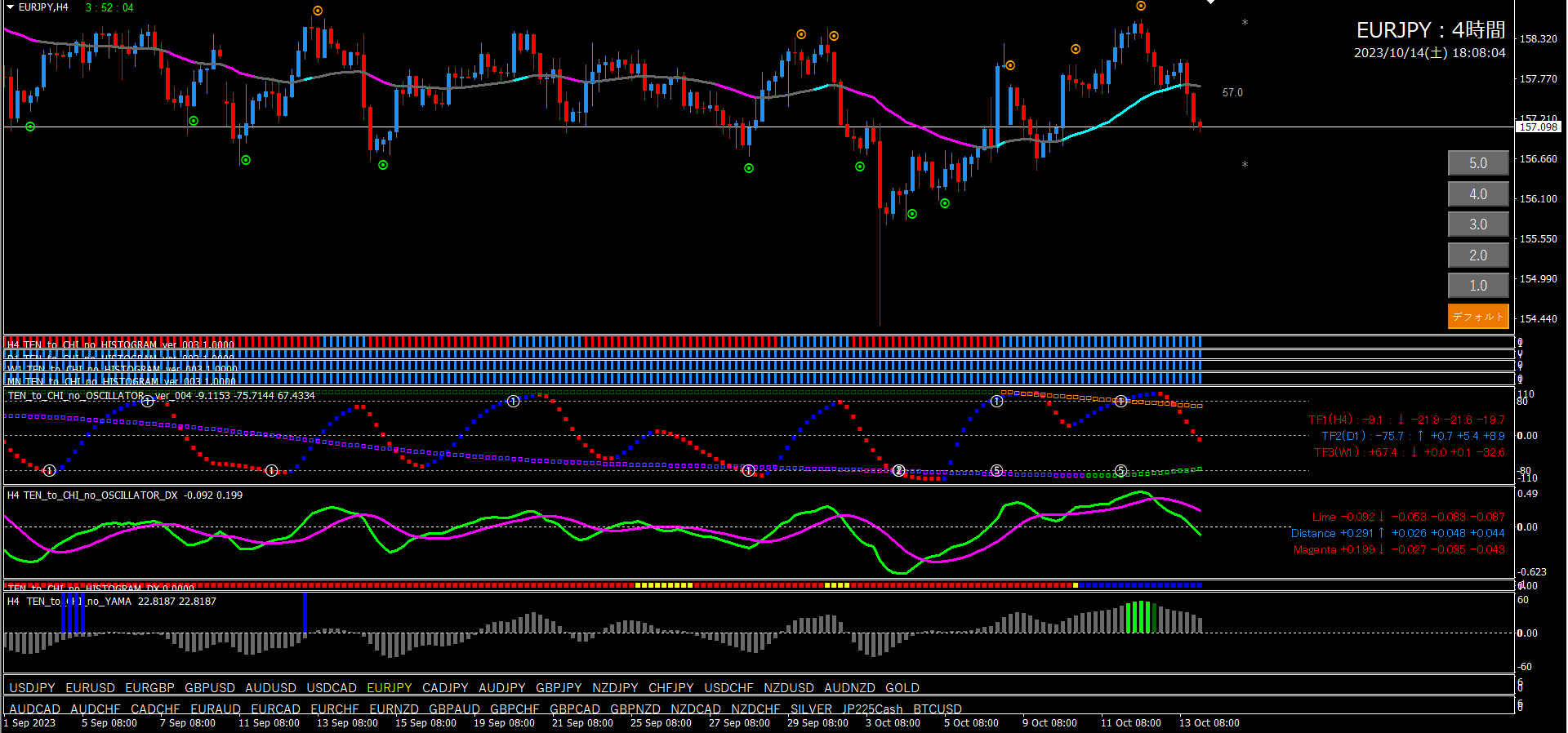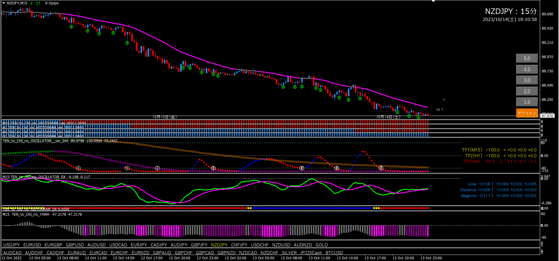 オシレーターサイン⑤が出ていますね。戻り売りのパターンです。ショートの点サイン、もしくはTF1の下降転換、もしくはオシレーターDXの下降クロスでショートエントリーというシナリオが作れます。