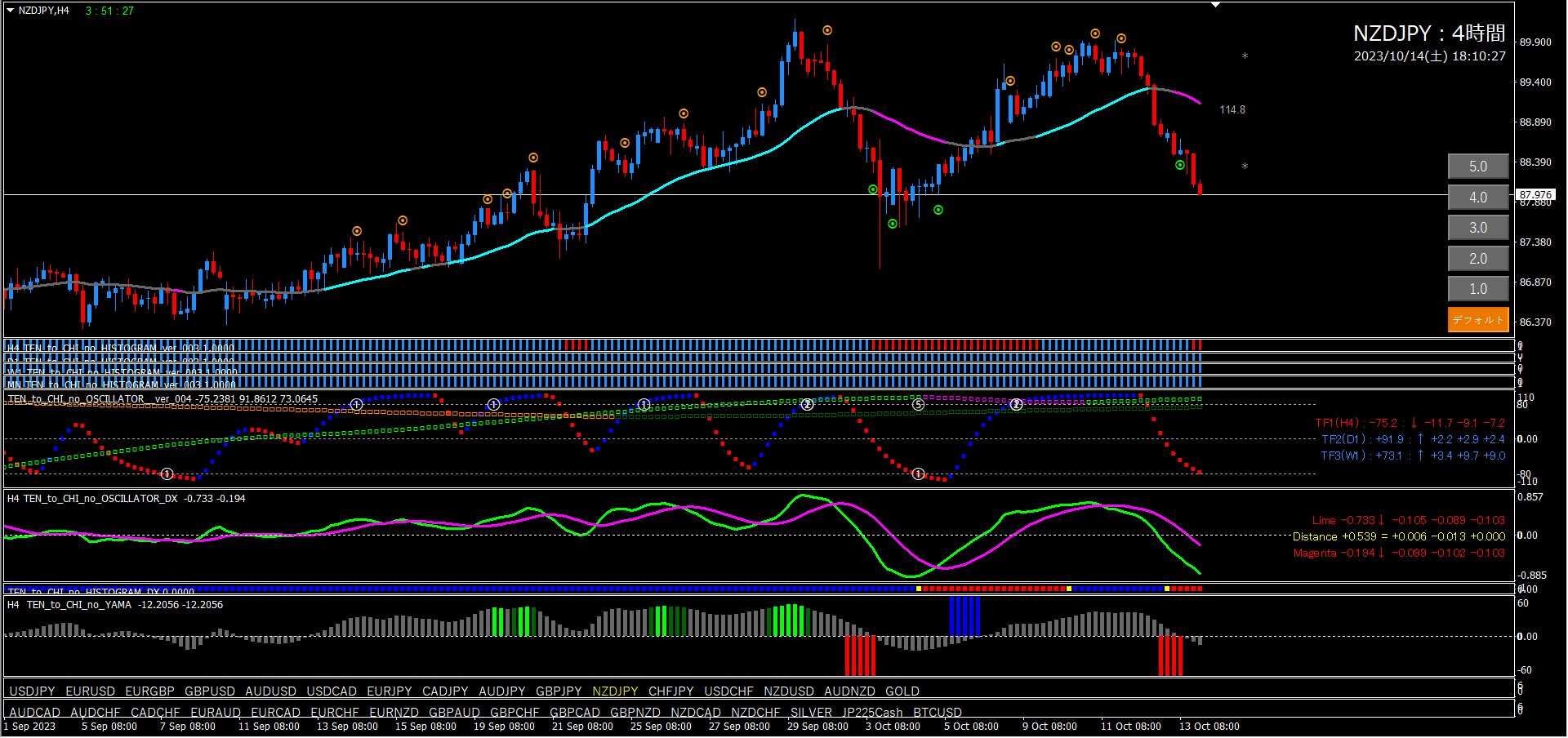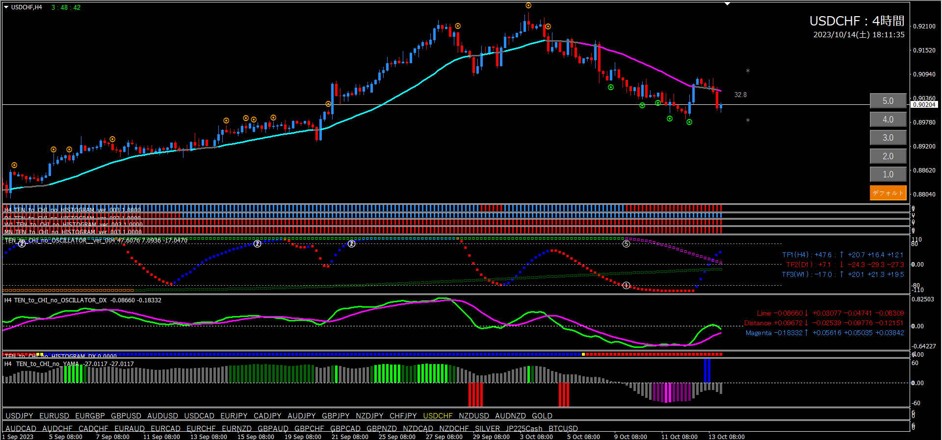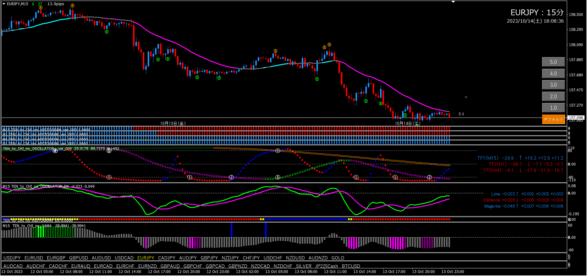 オシレーターサイン⑤が出ていますね。戻り売りのパターンです。ショートの点サイン、もしくはTF1の下降転換、もしくはオシレーターDXの下降クロスでショートエントリーというシナリオが作れます。