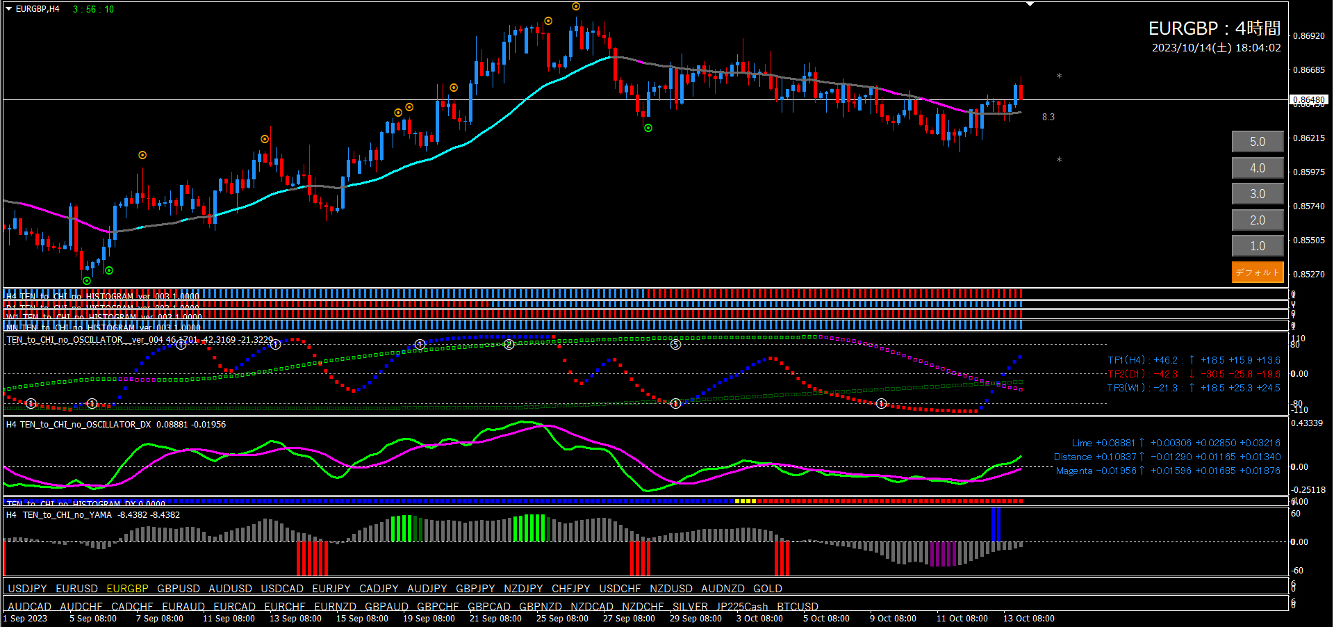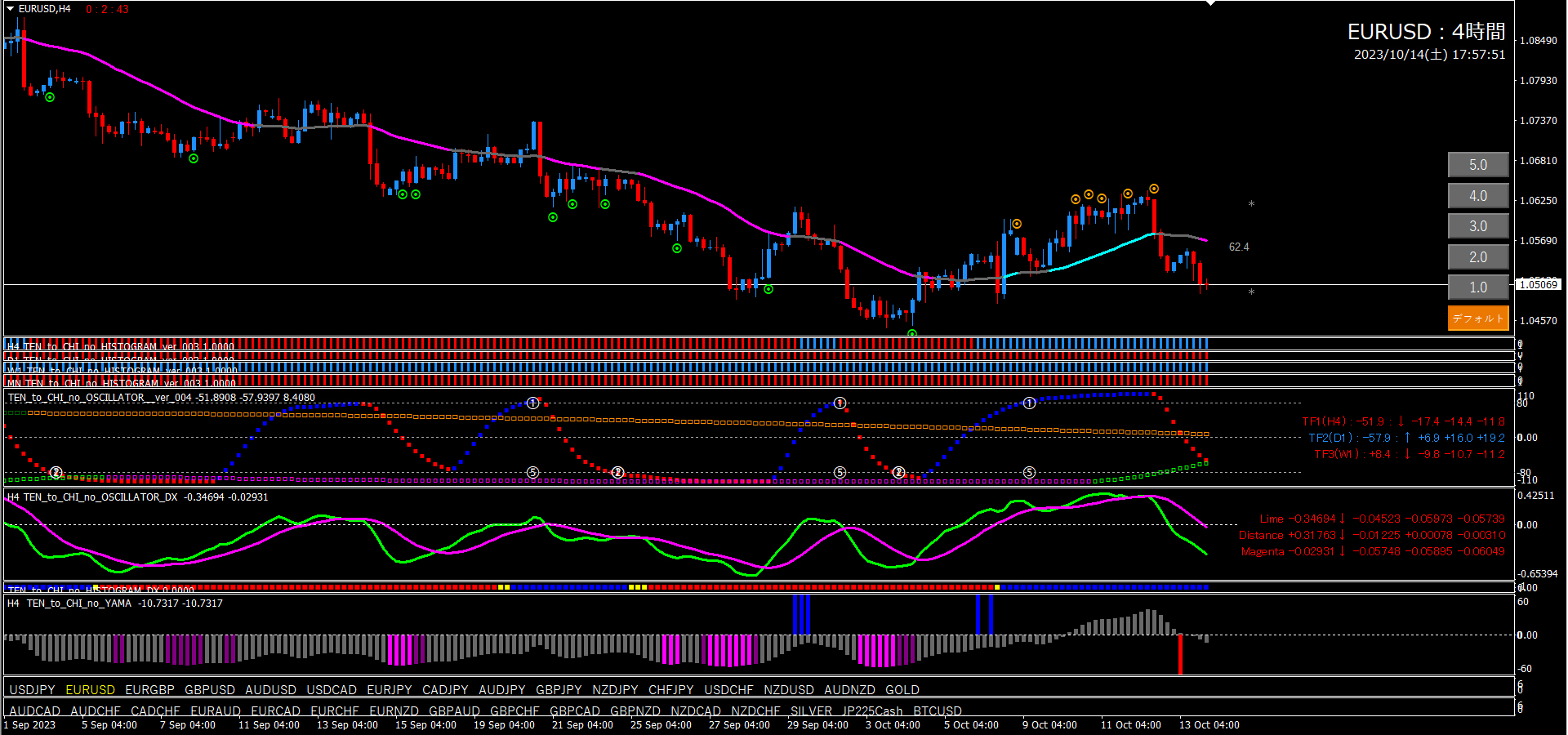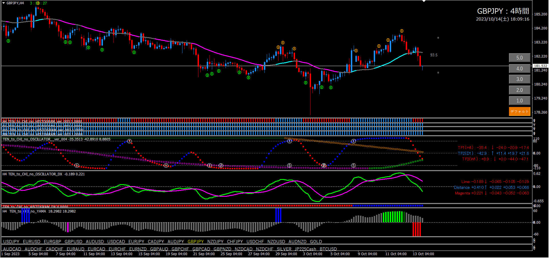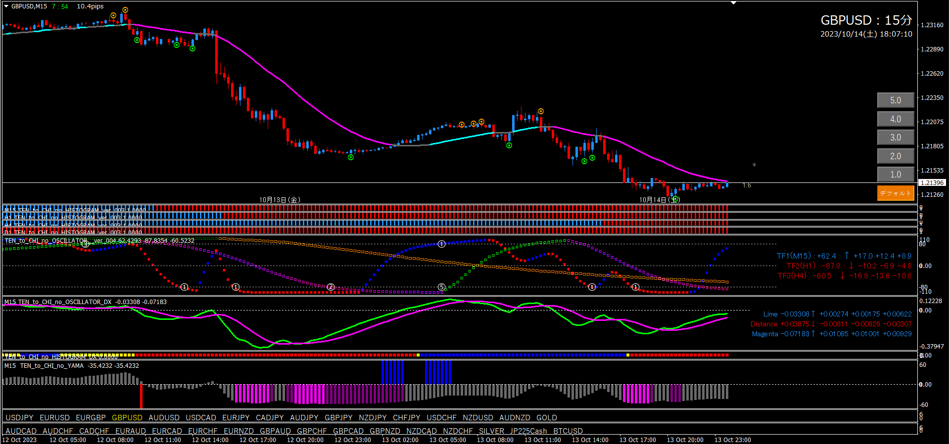 オシレーターサイン⑤が出ていますね。戻り売りのパターンです。ショートの点サイン、もしくはTF1の下降転換、もしくはオシレーターDXの下降クロスでショートエントリーというシナリオが作れます。