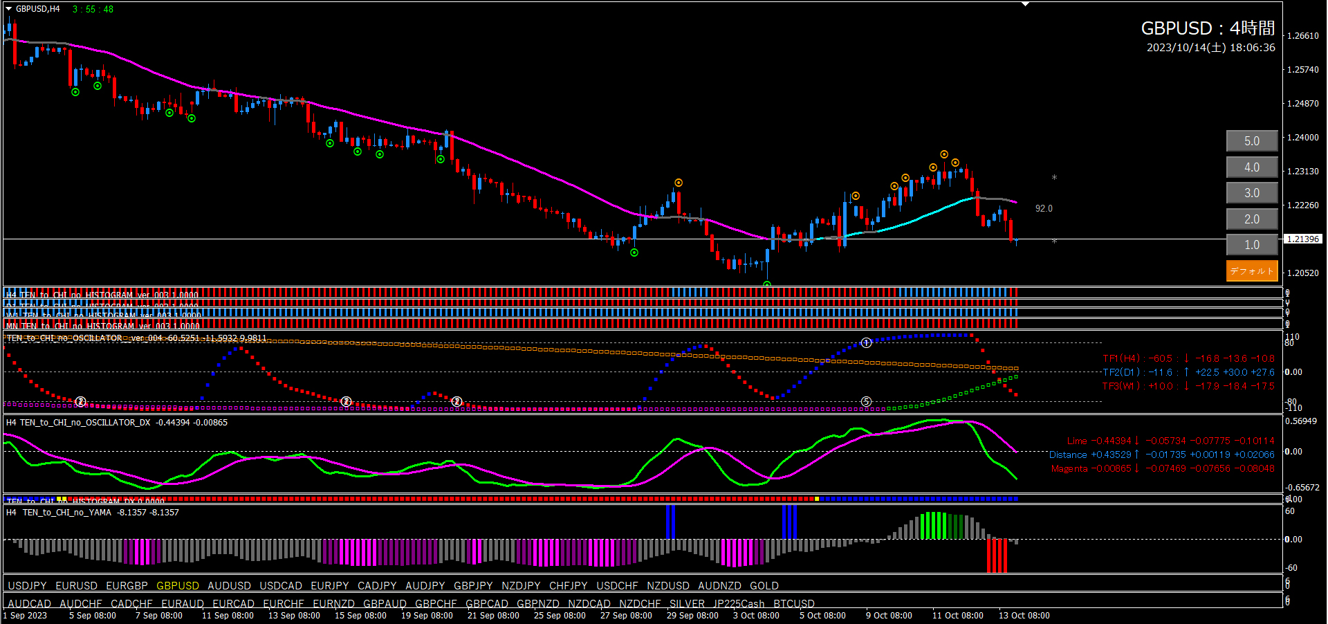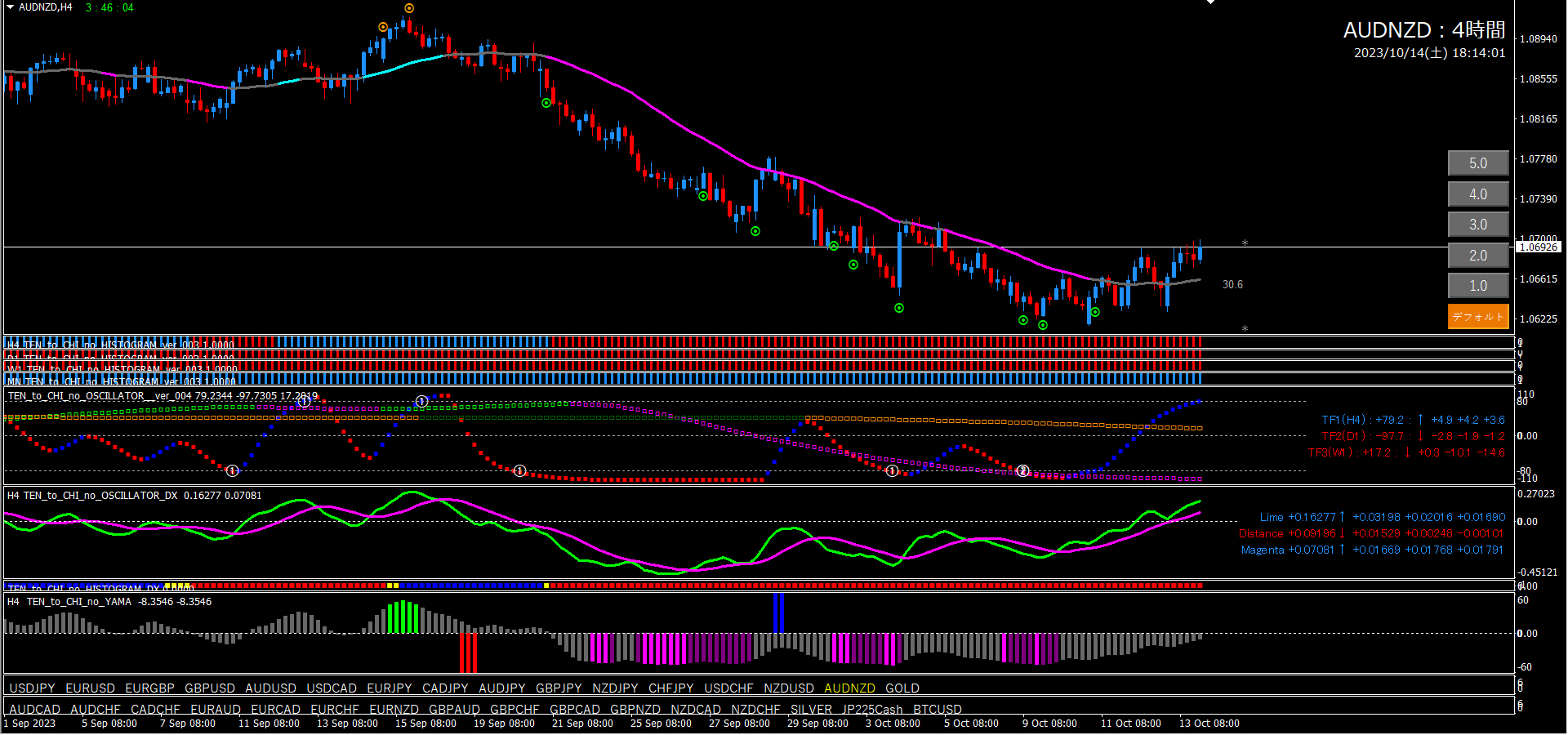 TF2は長い間-100に張り付いていますね。オシレーターサイン②が出そうなので、ローソク足の位置によってはトレードパターン③を使用しても良いと思います。基本のシナリオとしては、4時間足で上目線の判断後に、TF2の上昇転換を確認し、その後ロングエントリートリガーを見つけるという流れです。