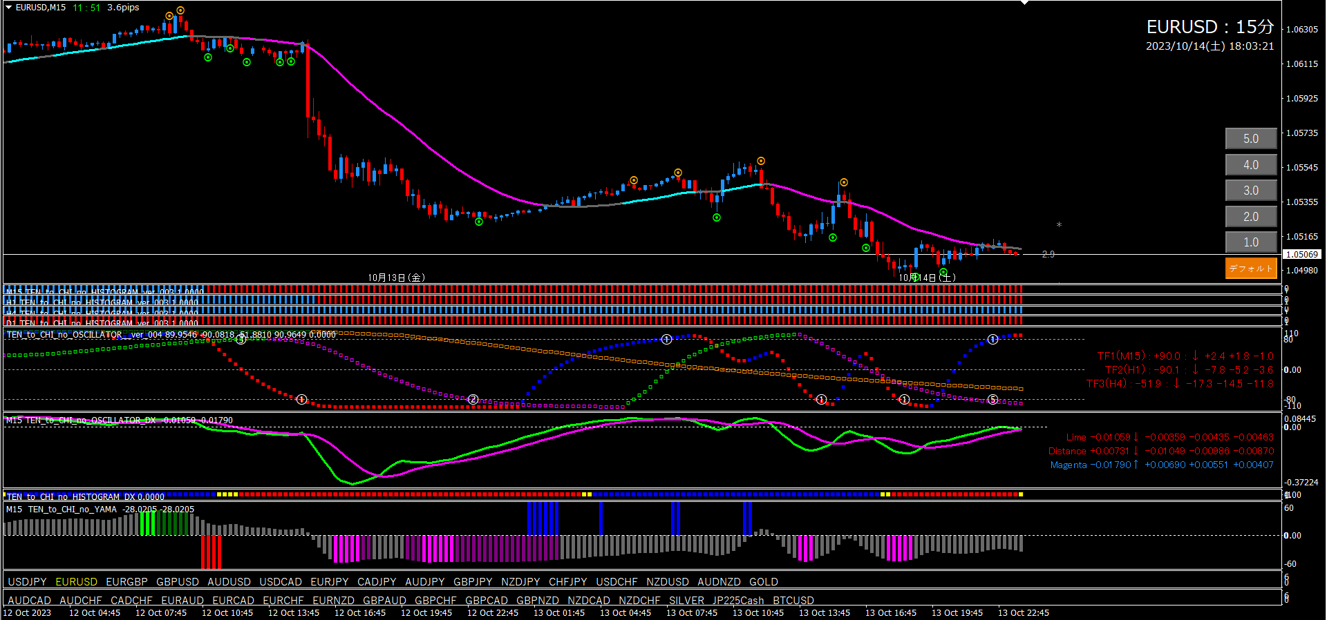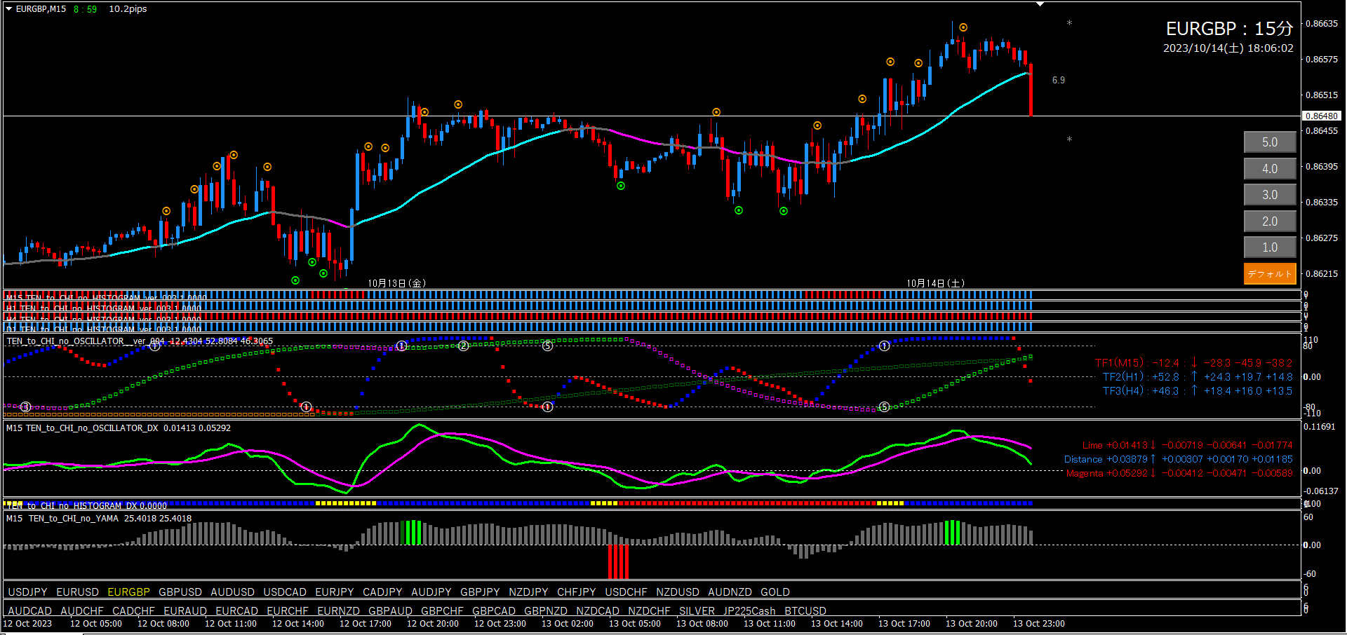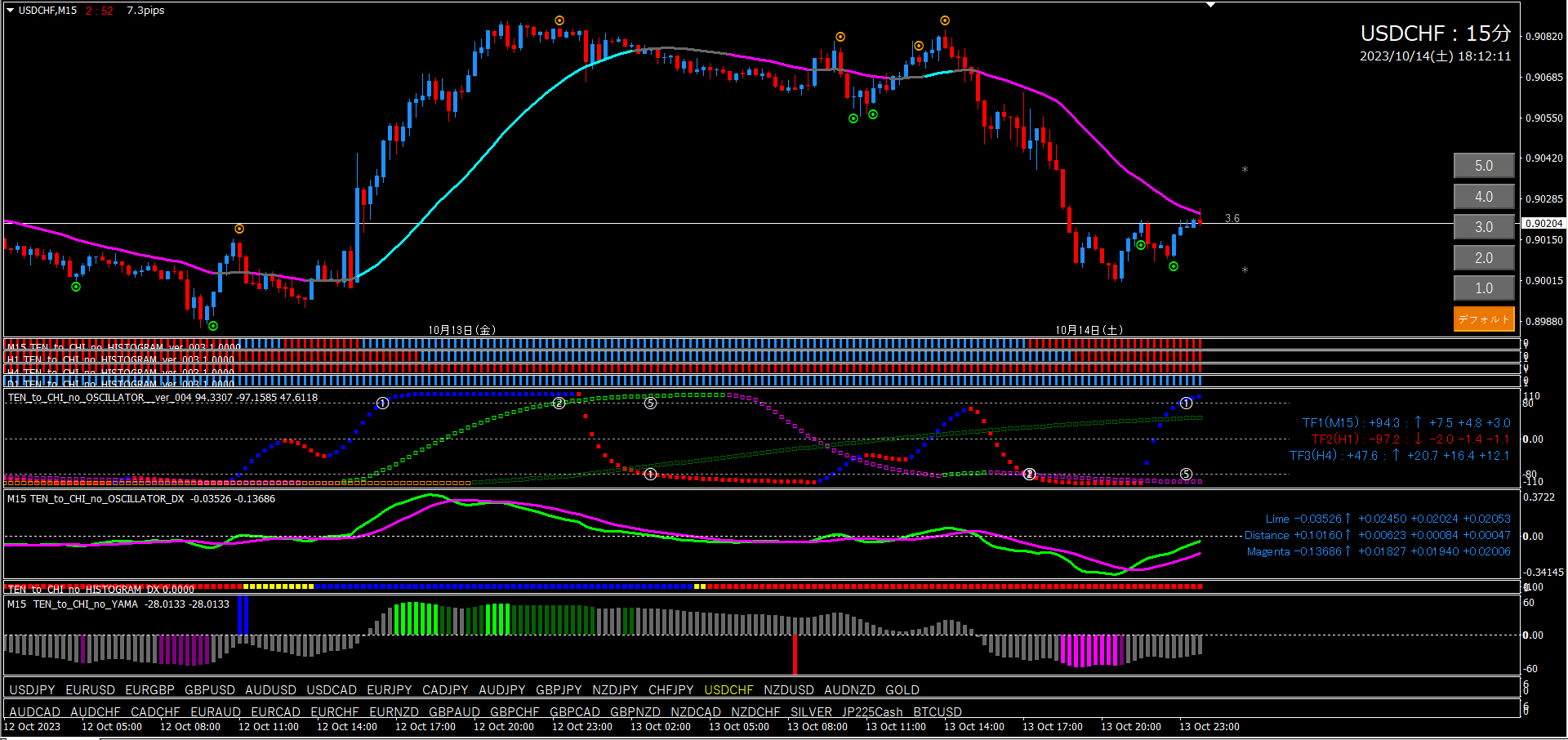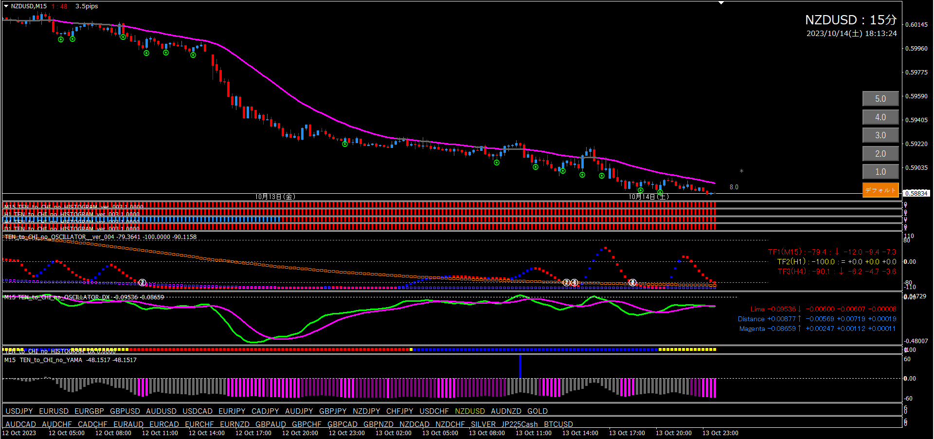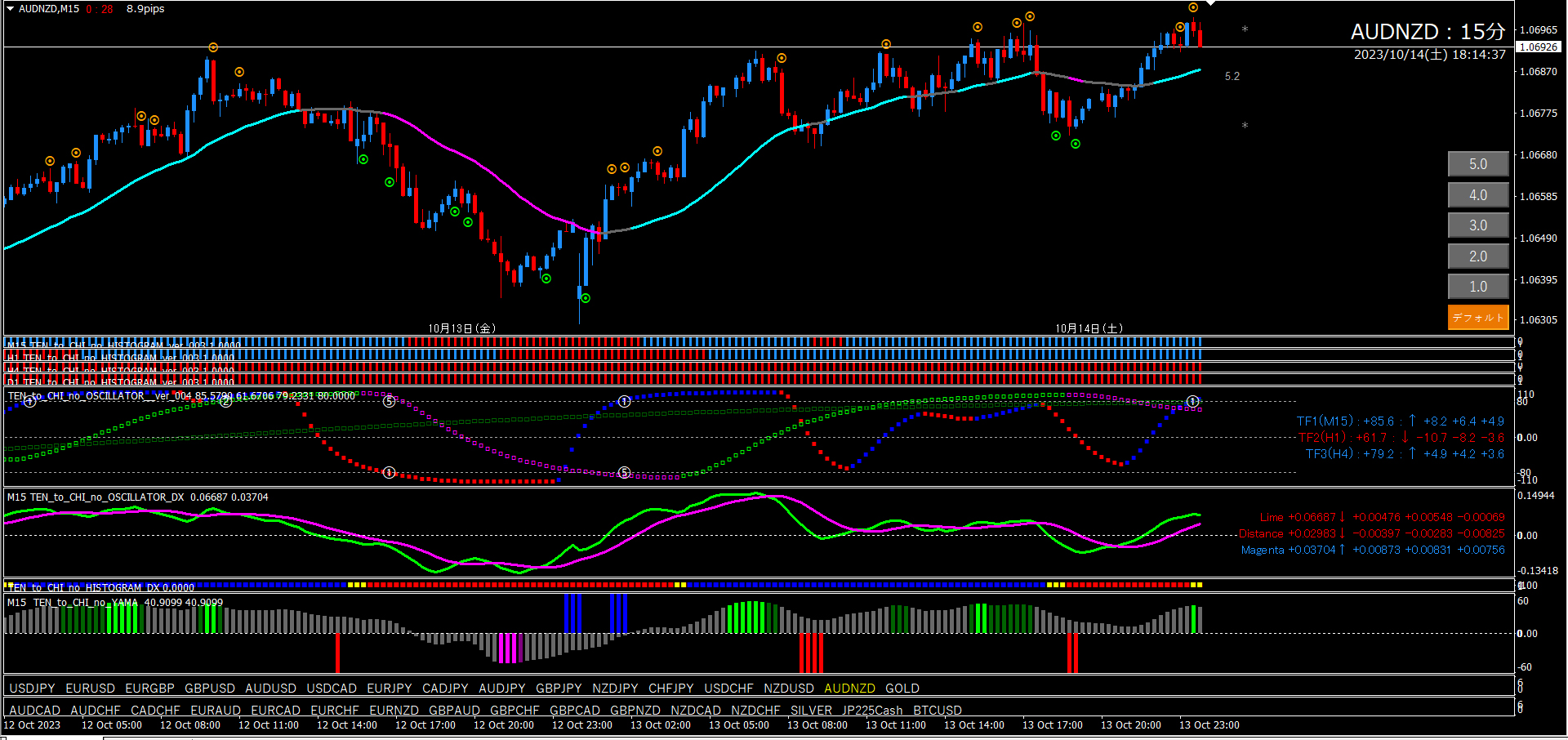 オシレーターTF2が長い張り付きからようやく下降してくれました。TF1は+80に向かっています。良い形状です。狙うは下目線。谷も出ていますし、オシレーターDXも形状はあまり良くありませんが下降クロスに向かっています。今の時点で下目線と判断して良いと思います。TF1の下降転換、もしくはオシレーターDXが完全に下降クロスしたら確実です。