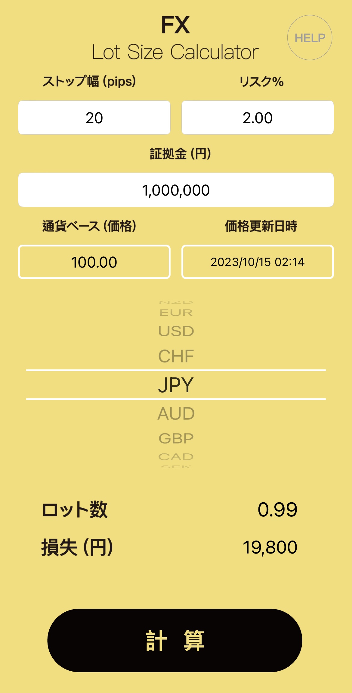 2%ルールでエントリーする場合、ロットはどのくらいにするのか計算するのが面倒な方には「FX Lot Size Calculator」というアプリがお勧めです。沢山のトレーダーの方がご利用されている有名なアプリなので知っている方も多いと思います。