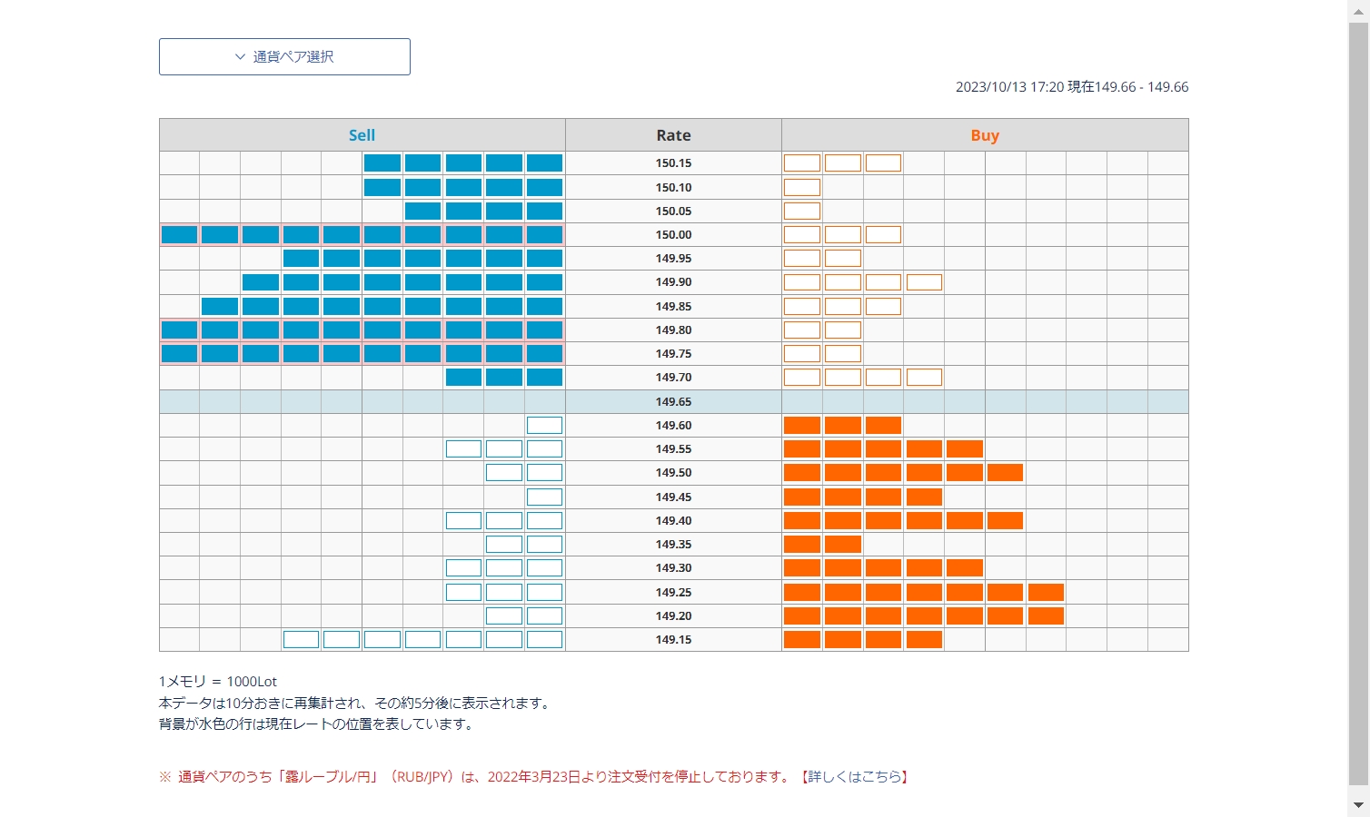 上記例だと149.75に売りの注文が多いことが分かります。そして実際に10月13日の相場で149.75に到達した際に反発して売りが多くでました。