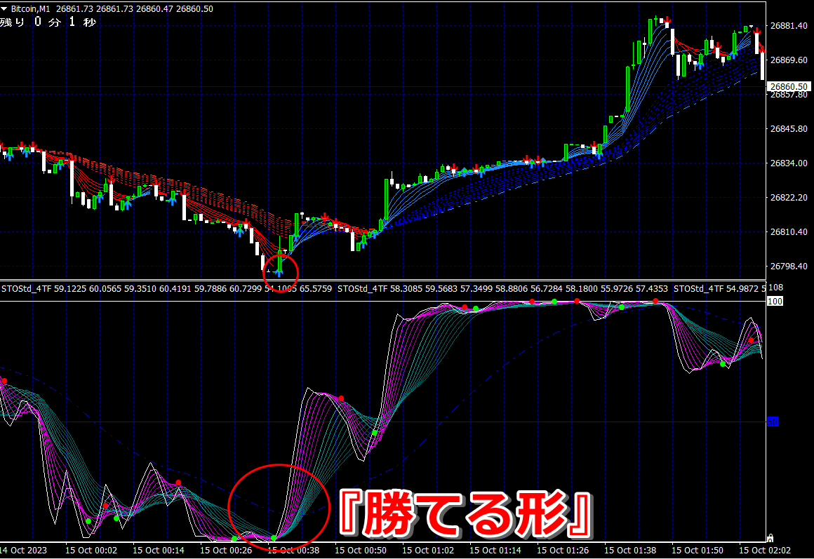 ② 矢印サイン点灯状態で、インジケーターのピンク色の帯が、緑の帯を下からすくい上げるような形状であれば、現在のローソク足が確定する数秒前か確定の直後に1分判定または3分判定でハイエントリーします。