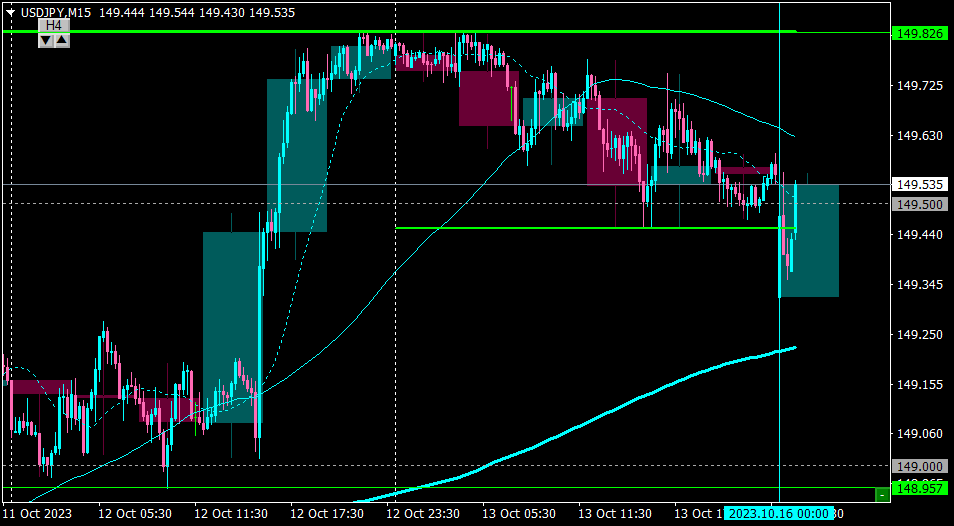 〇前日のトレード・USDJPY ドル円(15分足)先週の金曜は、強いと思われたサポート150.50を割り込んできたので、シナリオ変更しショート。ロング勢の損切りも巻き込んで大きく下げた。+71pips