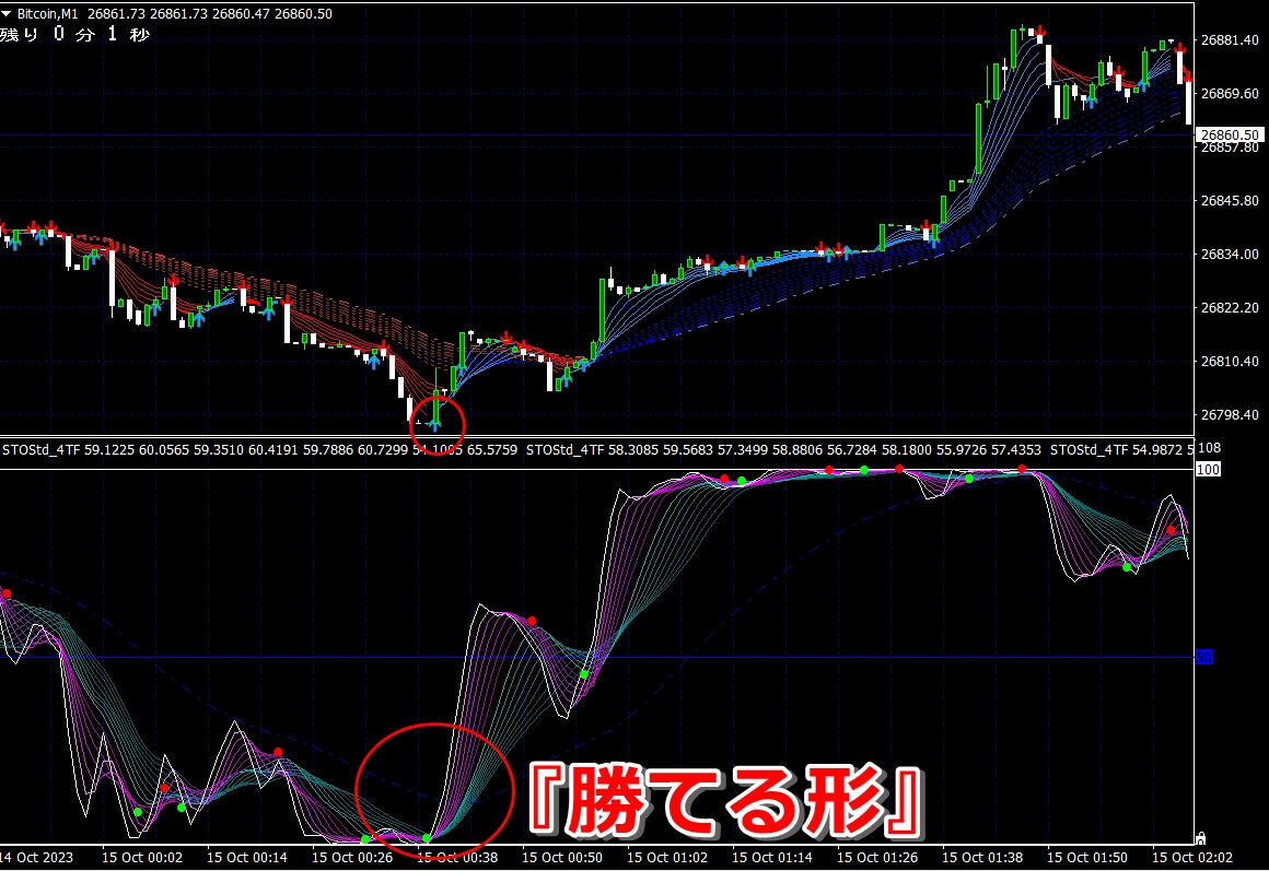 ② 矢印サイン点灯状態で、インジケーターのピンク色の帯が、緑の帯を下からすくい上げるような形状であれば、現在のローソク足が確定する数秒前か確定の直後に1分判定または3分判定でハイエントリーします。