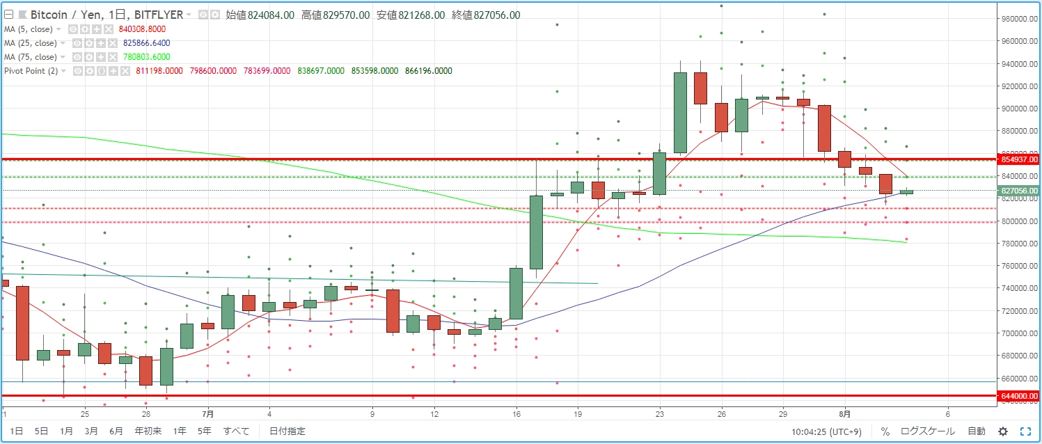 画像は2018年8月4日のキャプチャ。5日連続で続いた全面安が、ようやくストップした相場環境でした。ビットコインはギリギリでプラスに転じているといったところ。この5日連続のマイナス変動を押し目に、再度上昇できるかに注目です。