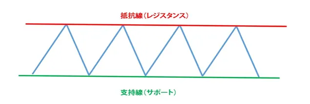 上の図から、価格が動いている共通の範囲があることがわかります。価格が到達して跳ね返る最も低いポイントはサポートと呼ばれ、価格が到達して跳ね返る最も高いポイントはレジスタンスと呼ばれます