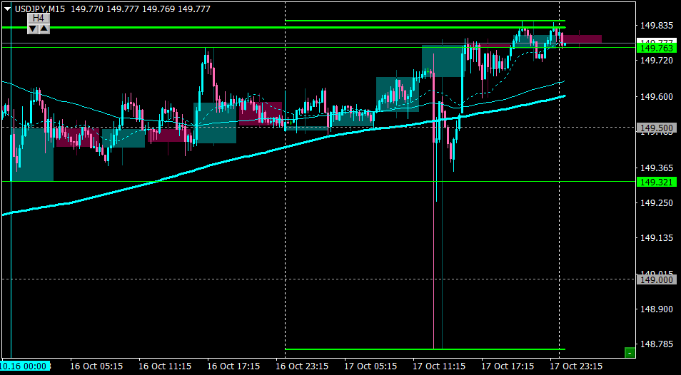 〇前日のトレード・USDJPY ドル円(15分足)先週の金曜は、強いと思われたサポート150.50を割り込んできたので、シナリオ変更しショート。ロング勢の損切りも巻き込んで大きく下げた。+71pips