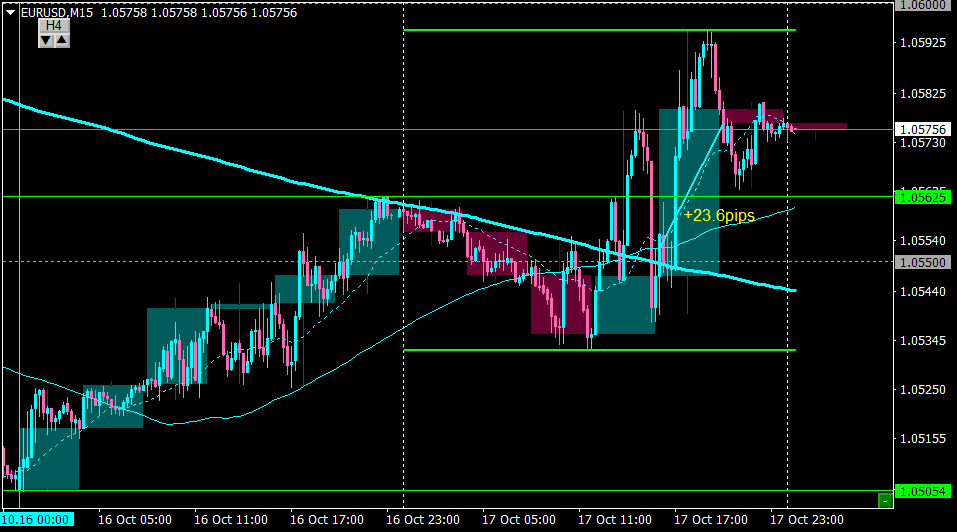 昨日は大きな逆三尊の右肩1.0550付近で押し目を作り、MAの抵抗をいったん上抜いたことを確認してからロング。+23pips