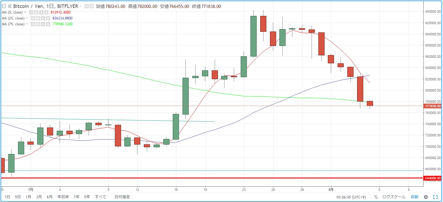 BTCJPYでデイトレする目安として、ピボットを確認します。4日は大陰線を作り、25SMAを割るどころから、75SMAまでをも一時割り込んでしまうといった相場環境でした。