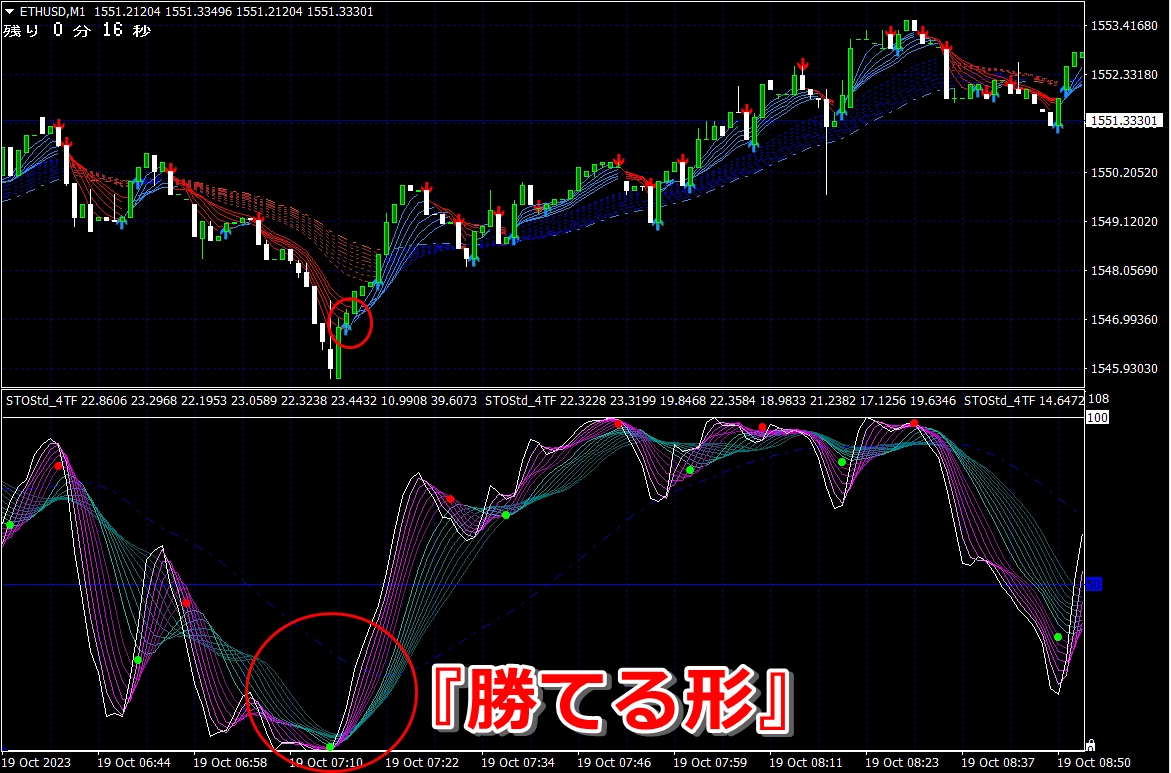 ② 矢印サイン点灯状態で、インジケーターのピンク色の帯が、緑の帯を下からすくい上げるような形状であれば、現在のローソク足が確定する数秒前か確定の直後に1分判定または3分判定でハイエントリーします。