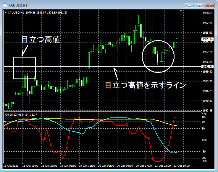 1時間足では、目立つ高値を示すライン付近まで下げている。