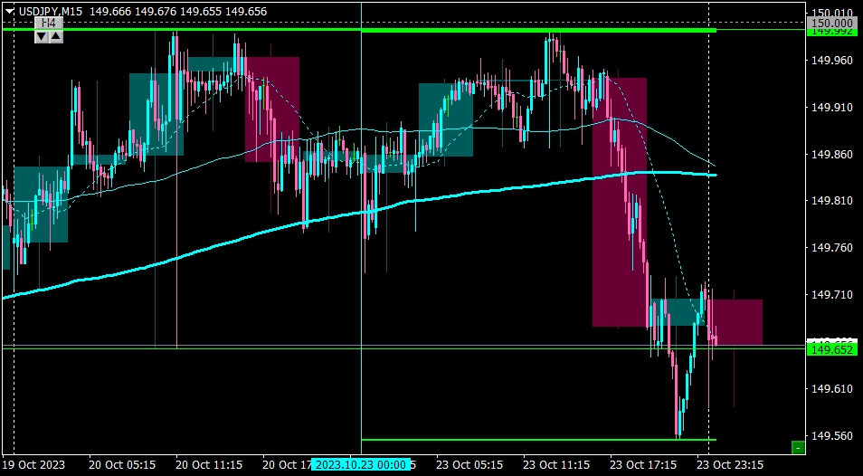 〇前日のトレード・USDJPY ドル円(15分足)先週の金曜は、強いと思われたサポート150.50を割り込んできたので、シナリオ変更しショート。ロング勢の損切りも巻き込んで大きく下げた。+71pips