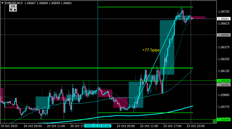 ニューヨーク時間にブレイクしたのでそのままホールドし、H4の足のクローズでイグジット。+77pips
