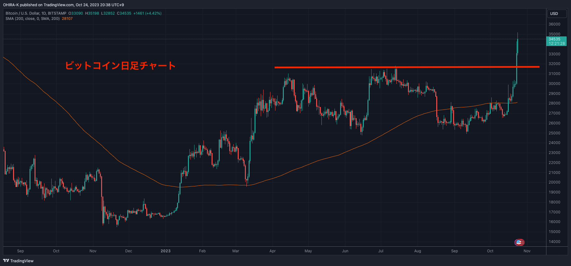 ニュースでは世界最大手の資産運用会社のブラックロックがBTCを購入しているというニュース。これはビットコインETF承認目前かと言われています。