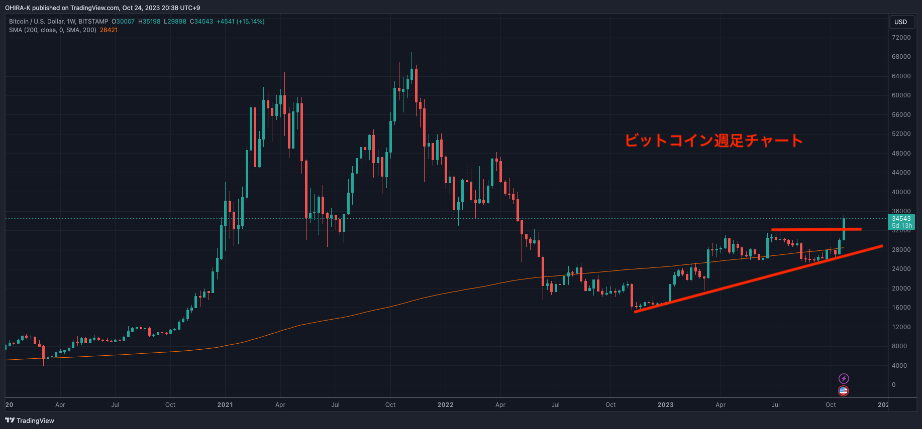 ビットコインは週足でも目立つ大きな価格上昇となりました。