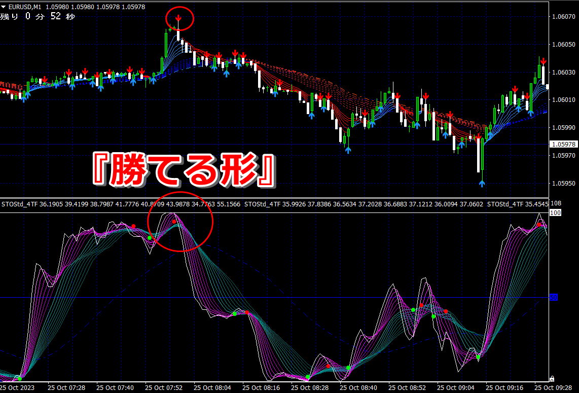 ※ サイン点灯=エントリーではありませんので、インジケーターが緑帯をすくい上げるような形状でない場合は、エントリーしません(サイン点灯でエントリーできる頻度は、数回に1度くらいです)。