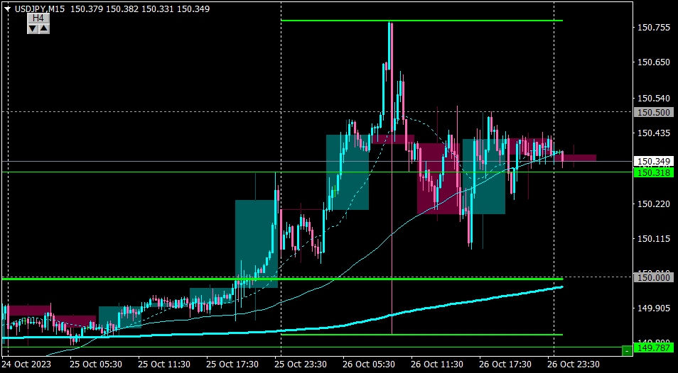 昨日は150.50まで上昇したが、そこから上を買ってくる向きは多くはなかった様子。ノートレード。