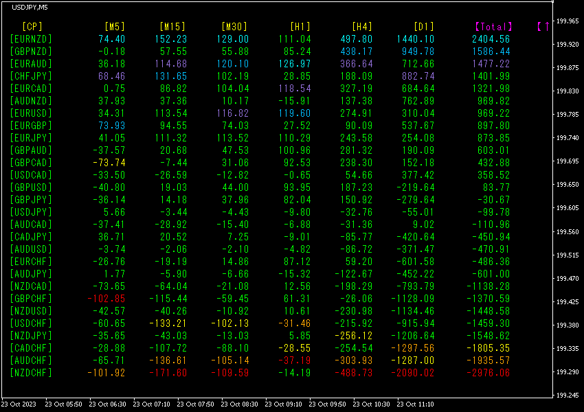 Total数値の降順に並び替えています。最も上の行にあるEURNZDは、[H1]を除く全時間足で青色系の表示色になっていて、Total数値が2404.56と大きなプラスの数字になっています。EURNZDに大きな上昇トレンドが発生していることを示しています。