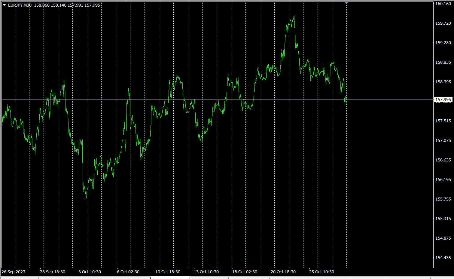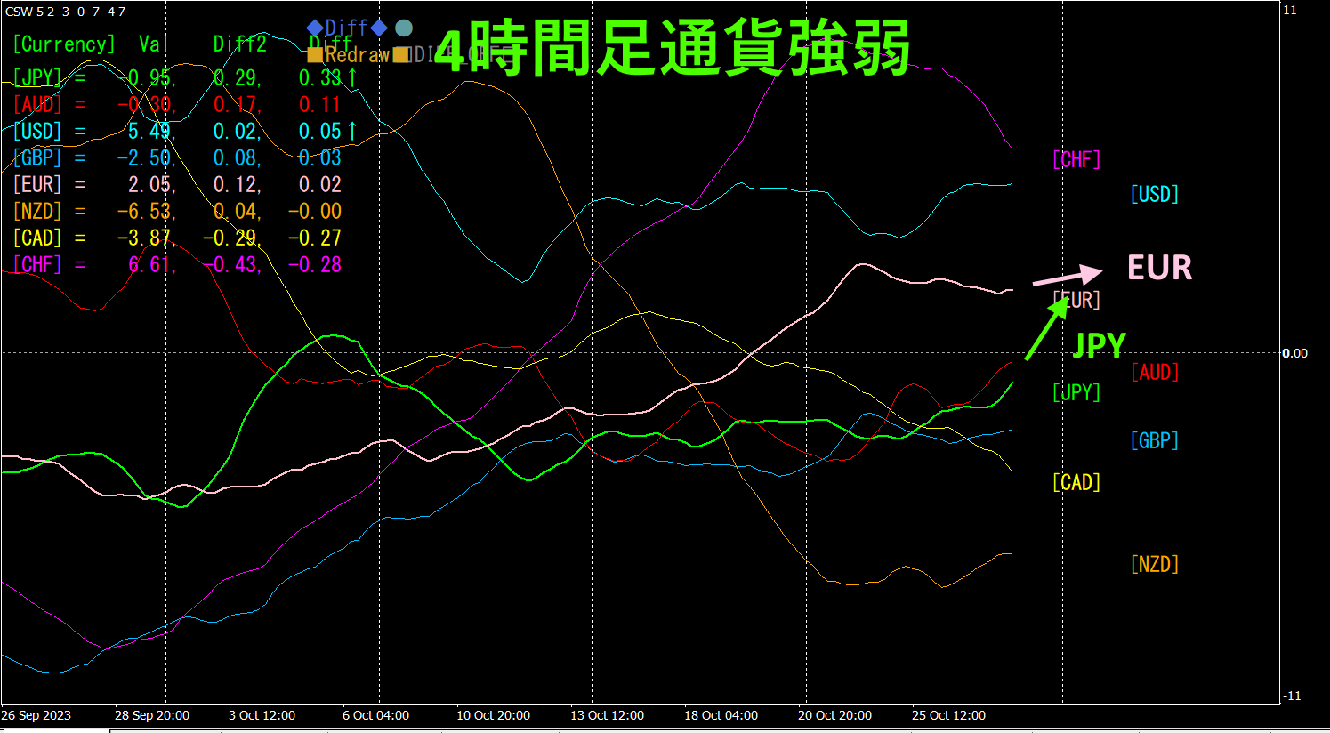 ピンク色がEUR、緑色がJPYです。EURは水平からやや上方向に、JPYは上方向に伸びています。従って、今後EURJPYは下落して行く見込みです。