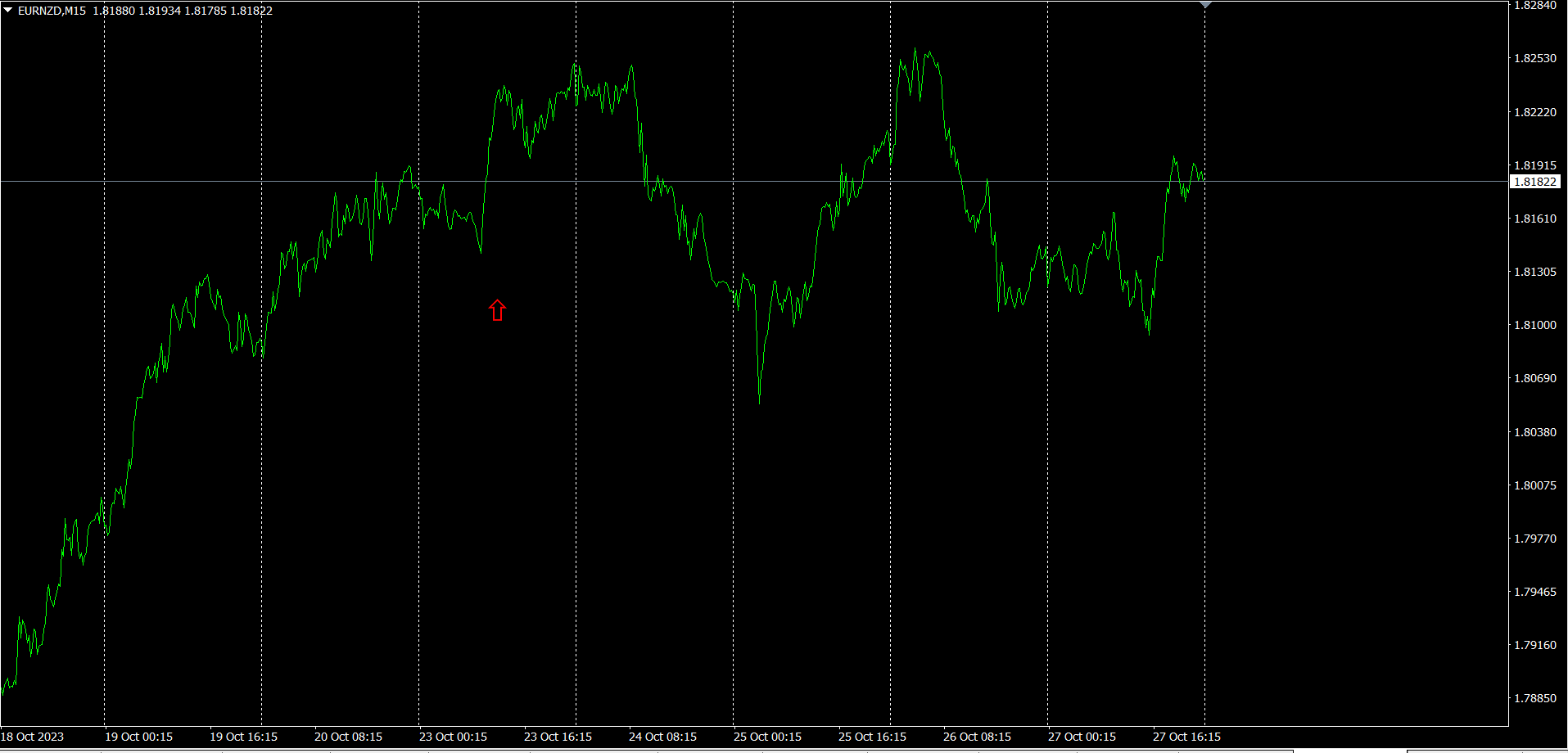 赤色の矢印がスクリーンショットを撮影した所です。右肩上がりの上昇トレンドの途中の急騰部分を捉えています。ここで買えば、当日決済で、約55pipsの利益が得られました。