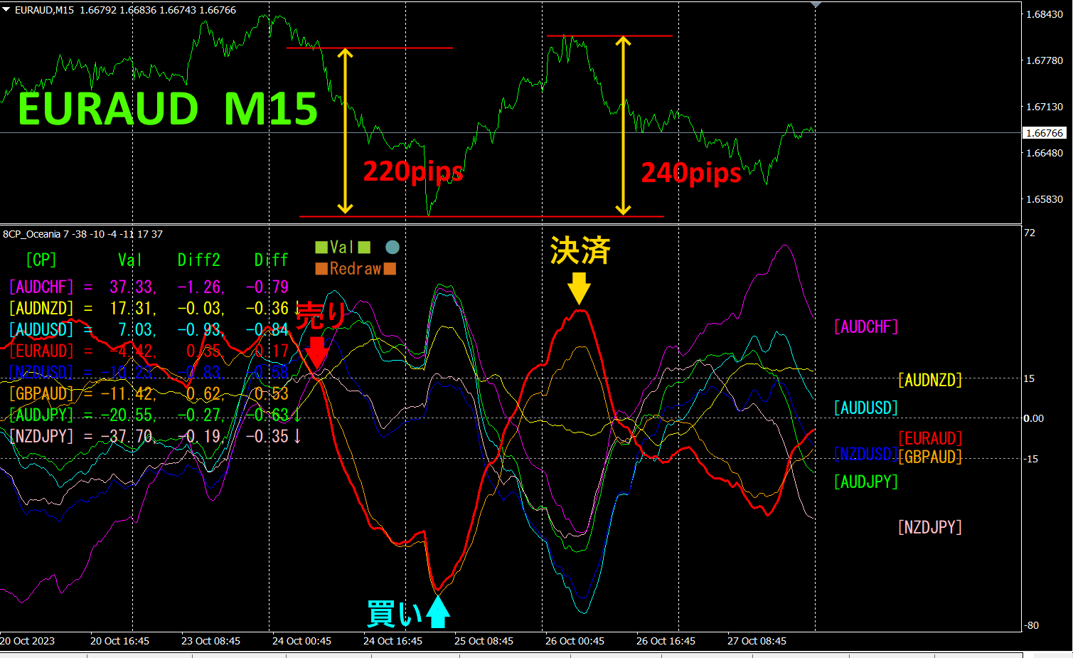 上半分は、EURAUDの15分足チャートです。下半分は、「8CP見える化インジケータ」によるものです。赤色太線のグラフがEURAUDに相当します。