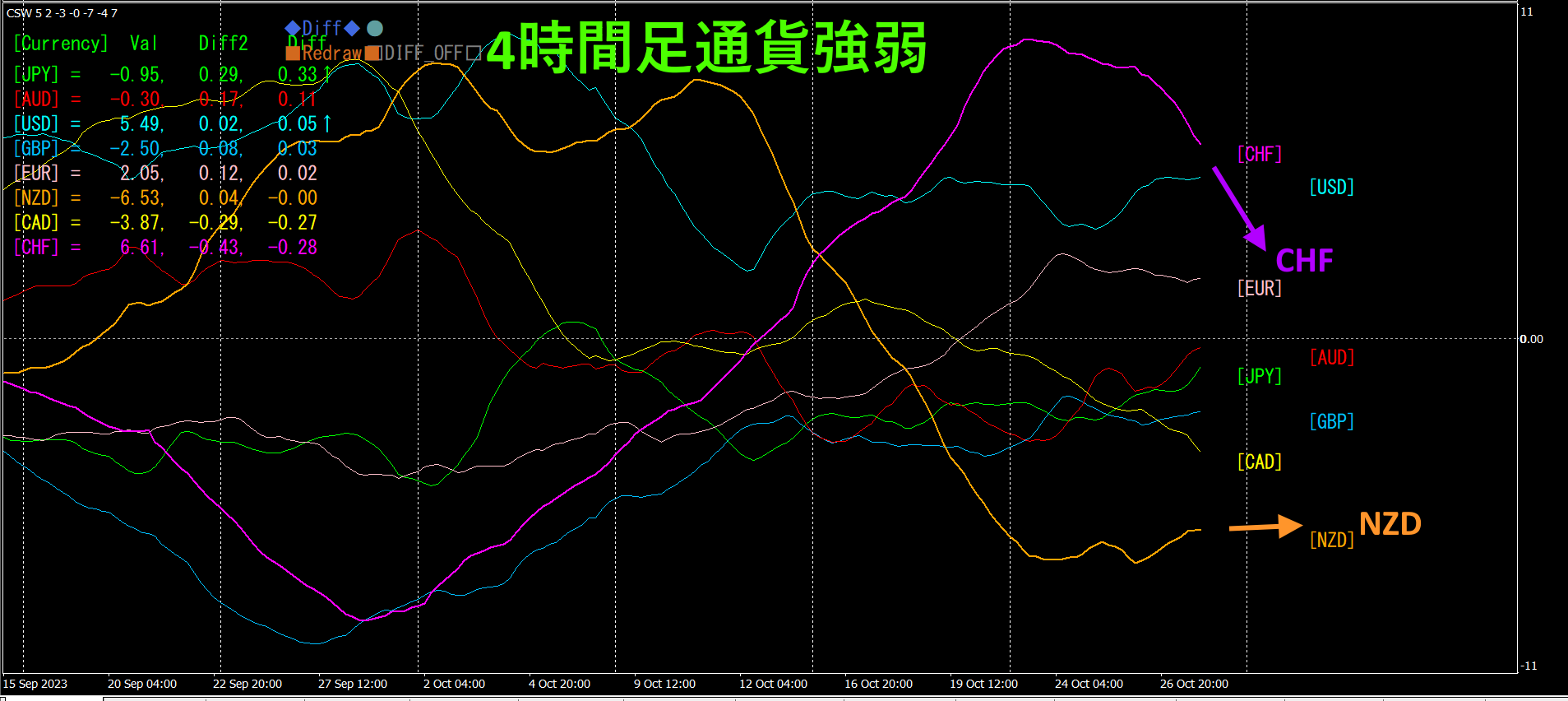 赤紫色がCHF、橙色がNZDです。CHFとNZDは綺麗な逆相関の関係になっています。4時間足通貨強弱チャートを見ると、CHFは急降下、NZDはダブルボトムを形成し反転上昇の兆しです。今後は、CHFとNZDの乖離が収束していく(NZDCHFが上がる)ことが予想されます。