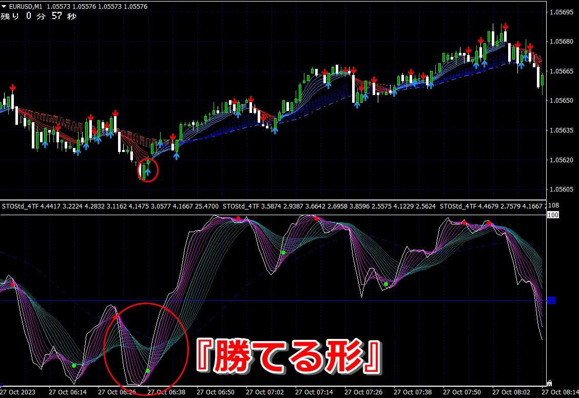 ② 矢印サイン点灯状態で、インジケーターのピンク色の帯が、緑の帯を下からすくい上げるような形状であれば、現在のローソク足が確定する数秒前か確定の直後に1分判定または3分判定でハイエントリーします。