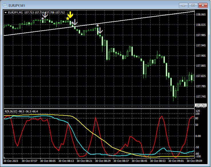 この例では、カウンタートレンドラインを挟んで、mBDSR(RCI2本フィルター)のサインが1回、R1R2S2のサインが3回点灯している。