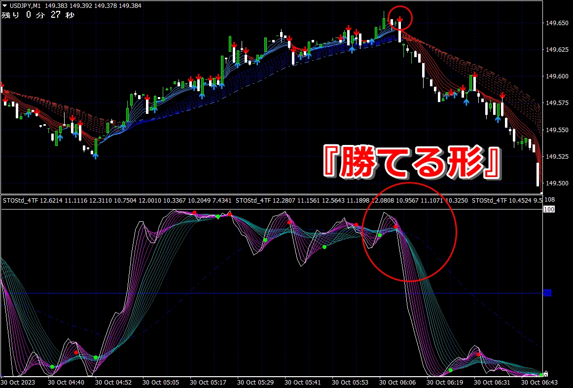 ② 矢印サイン点灯状態で、インジケーターのピンク色の帯が、緑の帯を下からすくい上げるような形状であれば、現在のローソク足が確定する数秒前か確定の直後に1分判定または3分判定でハイエントリーします。